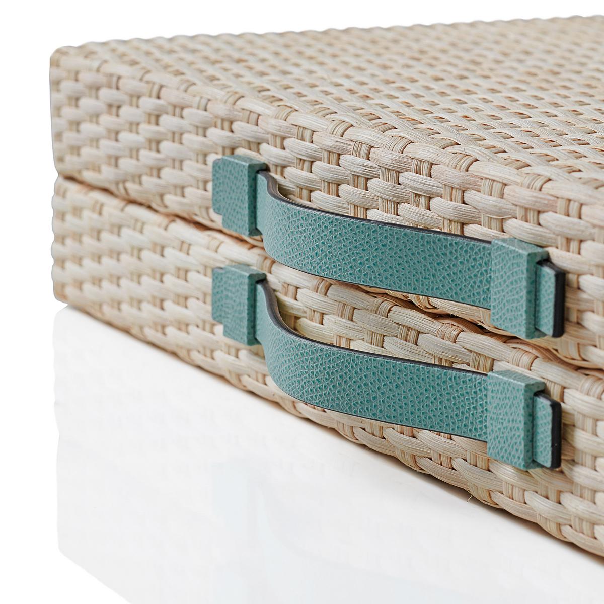 Der Backgammon-Koffer für den Strandurlaub. Das Backgammon-Spiel "Monte-Carlo" in Mintgrün von Pigment verbreitet lässigen Sommer-Flair im Boho-Stil. Der robuste Holzkoffer ist außen mit handgewebtem Rattan umschlossen. Die Griffe und das Spielfeld sind aus feinem Kalbsleder gefertigt und die Holz-Spielsteine mit Leder-Inlays ausgestattet. Mit den natürlichen Materialien und erfrischend modernen Farben erhebt Pigment den Backgammon-Koffer zu einem charmanten und modernen Einrichtungsobjekt für den gehobenen Lebensstil.