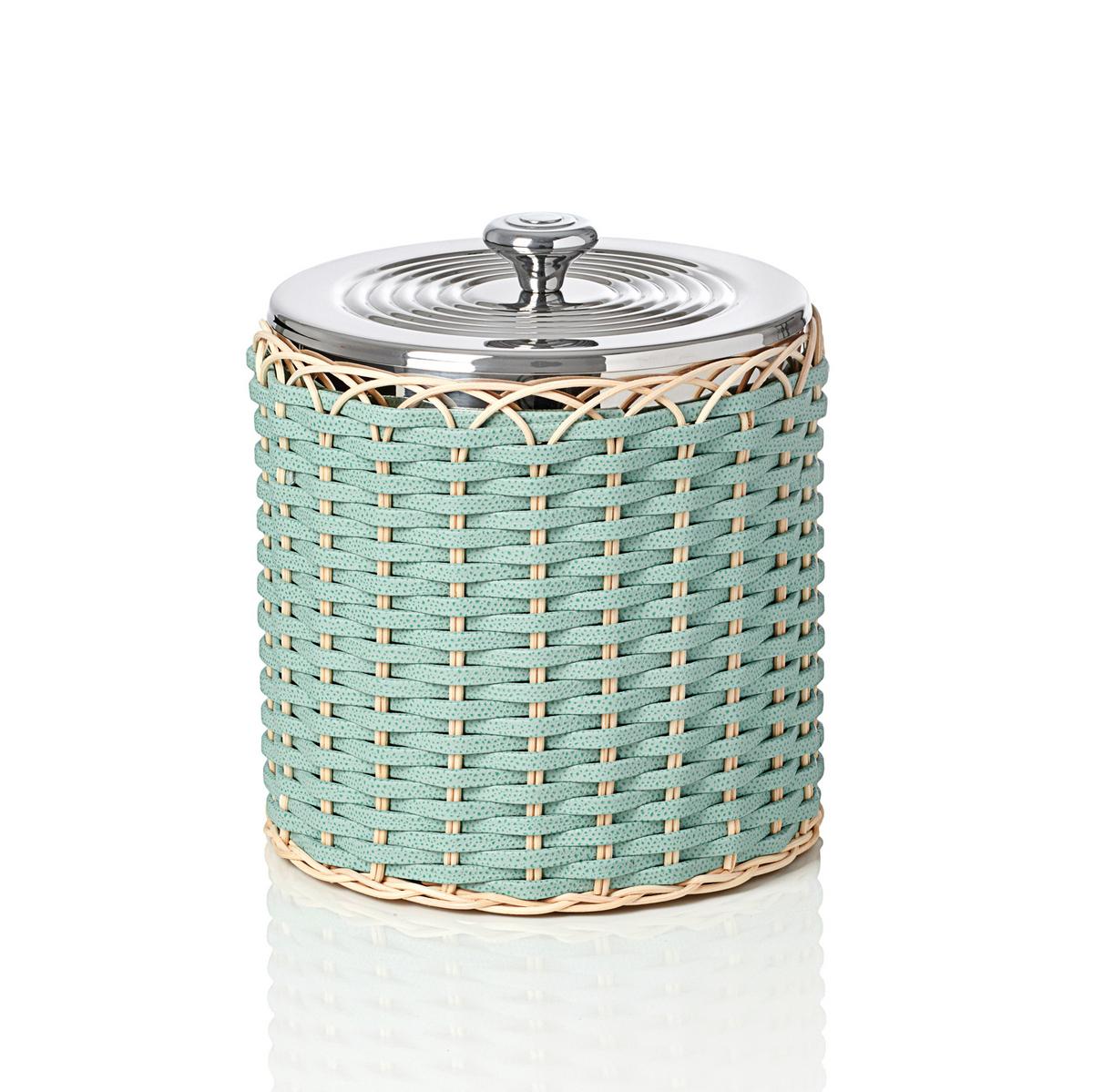 Ein erfrischendes Duo. Genießen Sie kühle Getränke an warmen Tagen mit den Weinkühlern und Eisbehältern "Menton" von Pigment. Die erfahrenen Handwerker der Manufaktur umflechten die doppelwandigen Behälter aus verchromtem Messing von Hand mit natürlichem Rattan und handgefärbten Kalbslederstreifen in Mintgrün. Das schlicht-elegante Flechtmuster und die modernen Farben erheben die einfachen Behälter zu charmanten und modernen Einrichtungsobjekten für den gehobenen Lebensstil.