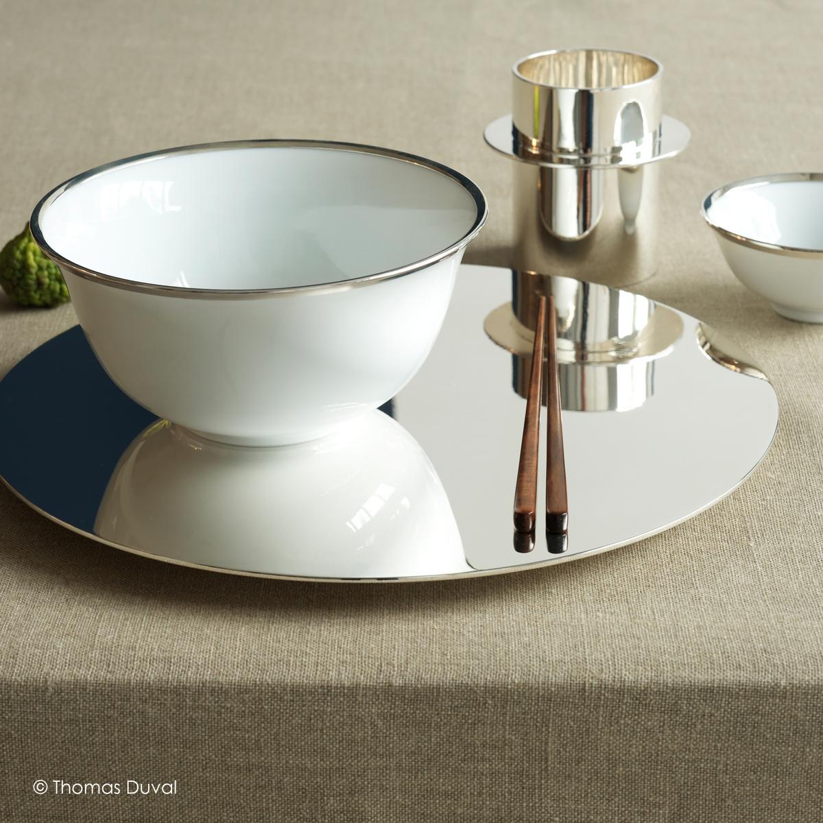 Japanische Kunsthandwerker veredeln die radikale Linienführung des Holzbestecks mit einer traditionellen Lacktechnik namens Fuki-Urushi. Durch wiederholtes Auftragen und Abwischen des natürlichen Urushi-Lacks mit weichen Tüchern entsteht eine dünne Lackschicht, die das Holz schützt und seine natürliche Maserung mit einem seidigen Schimmer kunstvoll hervorhebt. So entfaltet das edle Kirschbaumholz eine authentische und kraftvolle Eleganz, die einen magischen Kontrast zu den makellosen Oberflächen versilberter Tafelservice bildet. Eine visionäre Erweiterung der Tischkultur aus dem Hause Puiforcat, die eine neue Beziehung zwischen Holz und Silber definiert.