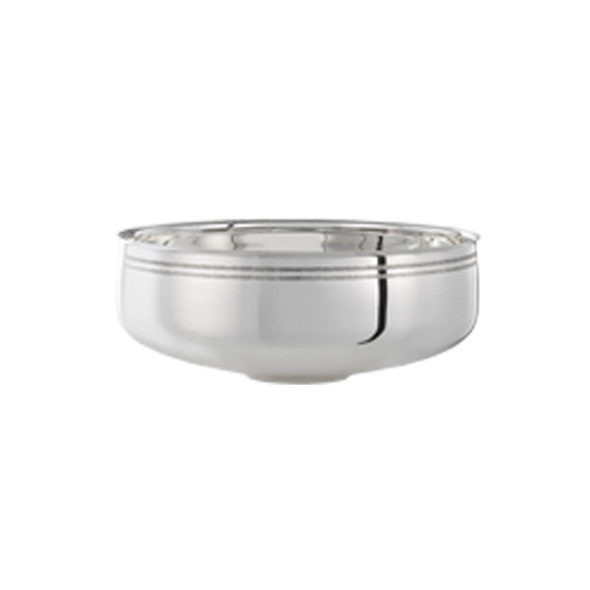 Der rundliche Boden verdeckt den kleinen Fuß der Schalen und lässt sie dadurch visuell schweben. Ein Dekor aus zwei gemeißelten Linien am oberen Rand bildet einen Kontrast zu den makellosen Silberflächen. Die kleine Ausführung ist zusätzlich mit dem Dekor "Pavé" erhältlich, welches aus mehreren horizontalen Linien besteht.