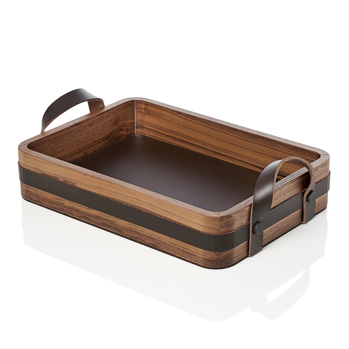 Elegant und vielseitig präsentiert sich das Tablett "Toiles de Noyer" von Rabitti 1969. Die Konstruktion aus Walnussholz mit sanft gerundeten Ecken verbindet zeitgenössische Linien mit einer organischen Leichtigkeit. Feine Einsätze aus Sattelleder setzen einen luxuriösen Kontrast und unterstreichen die besondere Haptik.