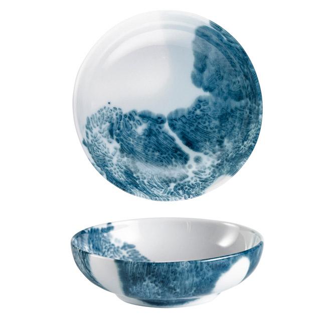 "Abysses" ist ein Entwurf der französischen Künstlerin und Modeillustratorin Aurore de la Morinerie. Inspiriert von der chinesischen Kalligraphie malte sie die Vorlagen in kühnen Gesten mit Pinseln auf Porzellanoberflächen. So entstand eine Fülle an Texturen und Farbverläufen, die zu weitschweifigen Unterwasserwelten voller Mystik und Poesie verschmelzen.
