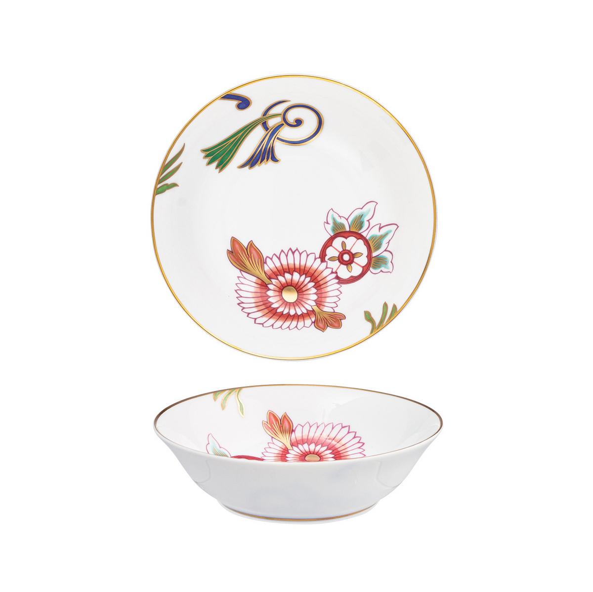 Designer Olivier Maillefer entwarf die "Imari" Dekore als Wasserfarbenmalereien. Frei von steifen Strukturen und strengen Symmetrien, kreierte er für jedes Stück der umfangreichen Kollektion neue Blumenmotive von leichtfüßiger Eleganz und heiterer Spontaneität. Großzügige Feingold-Applikationen bringen die insgesamt 17 verschiedenen Farben der Blumendekore lebendig zum Leuchten. Tiefblaue, von goldenen Mustern überzogene Teller bilden einen fantastischen Kontrast zur farbenfrohen Blumenpracht.