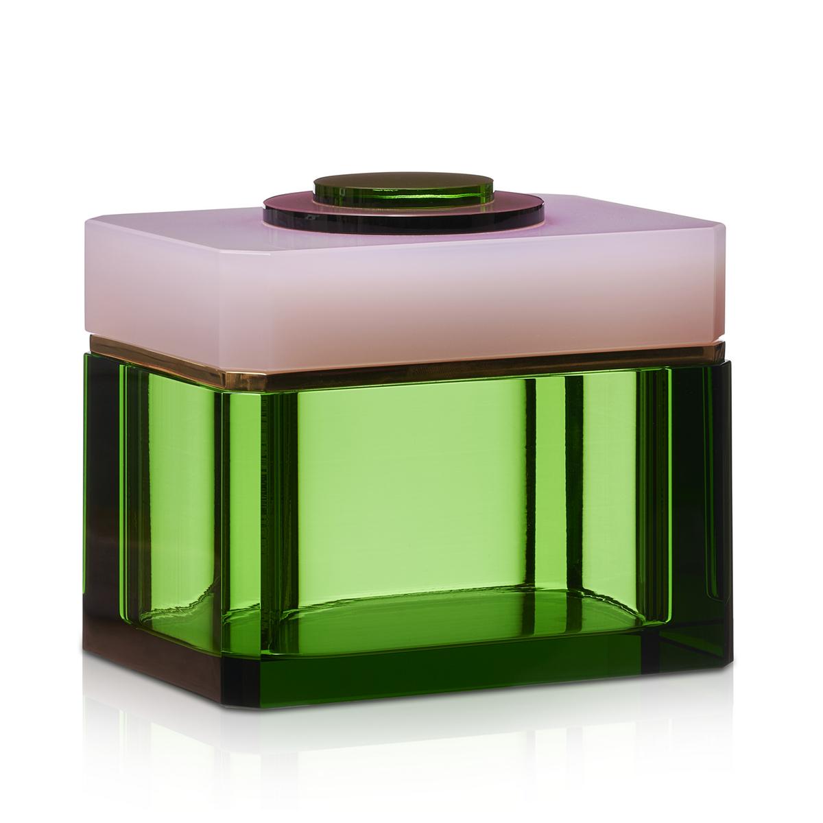 Jede Box wird aus massivem Kristallglas in traditioneller Handwerkskunst gefertigt. Ein feiner Messingrand am oberen Rand der Box – sichtbar unterhalb des Deckels – verleiht dem Design eine dezente, edle Wärme und unterstreicht den luxuriösen Charakter der Objekte. Auf den Deckeln setzen markante Glasornamente – das grüne Auge, der blaue Mond und das weiße Herz – charakteristische Akzente und machen die Boxen zu skulpturalen Statements.
