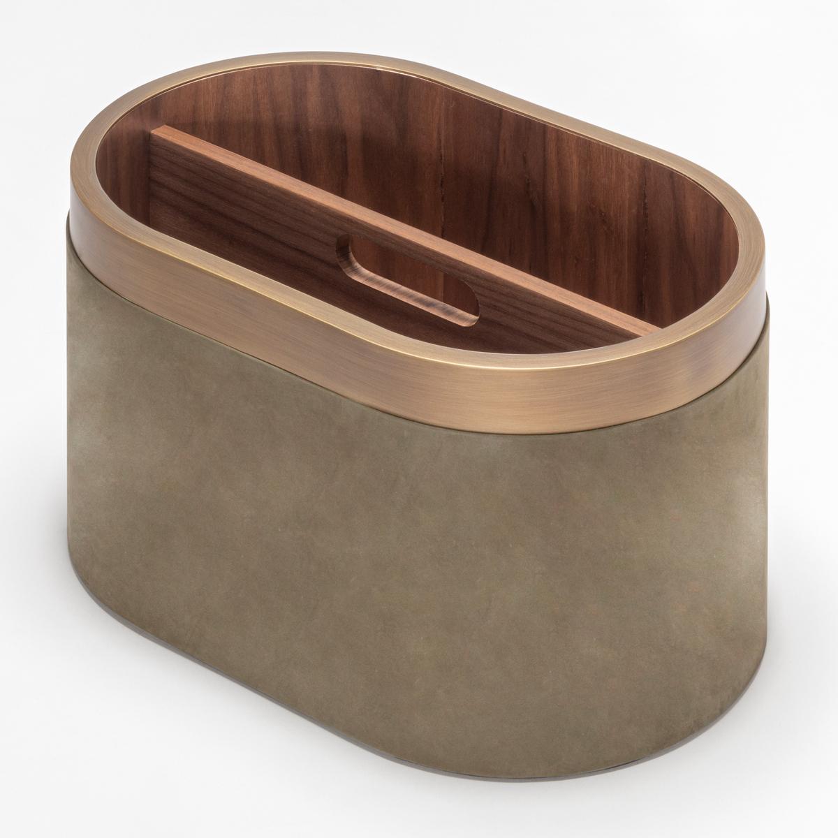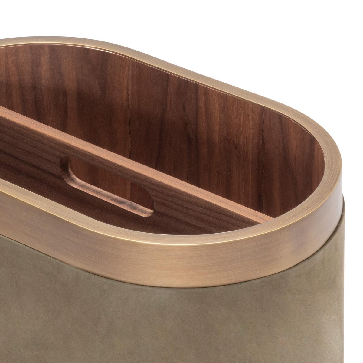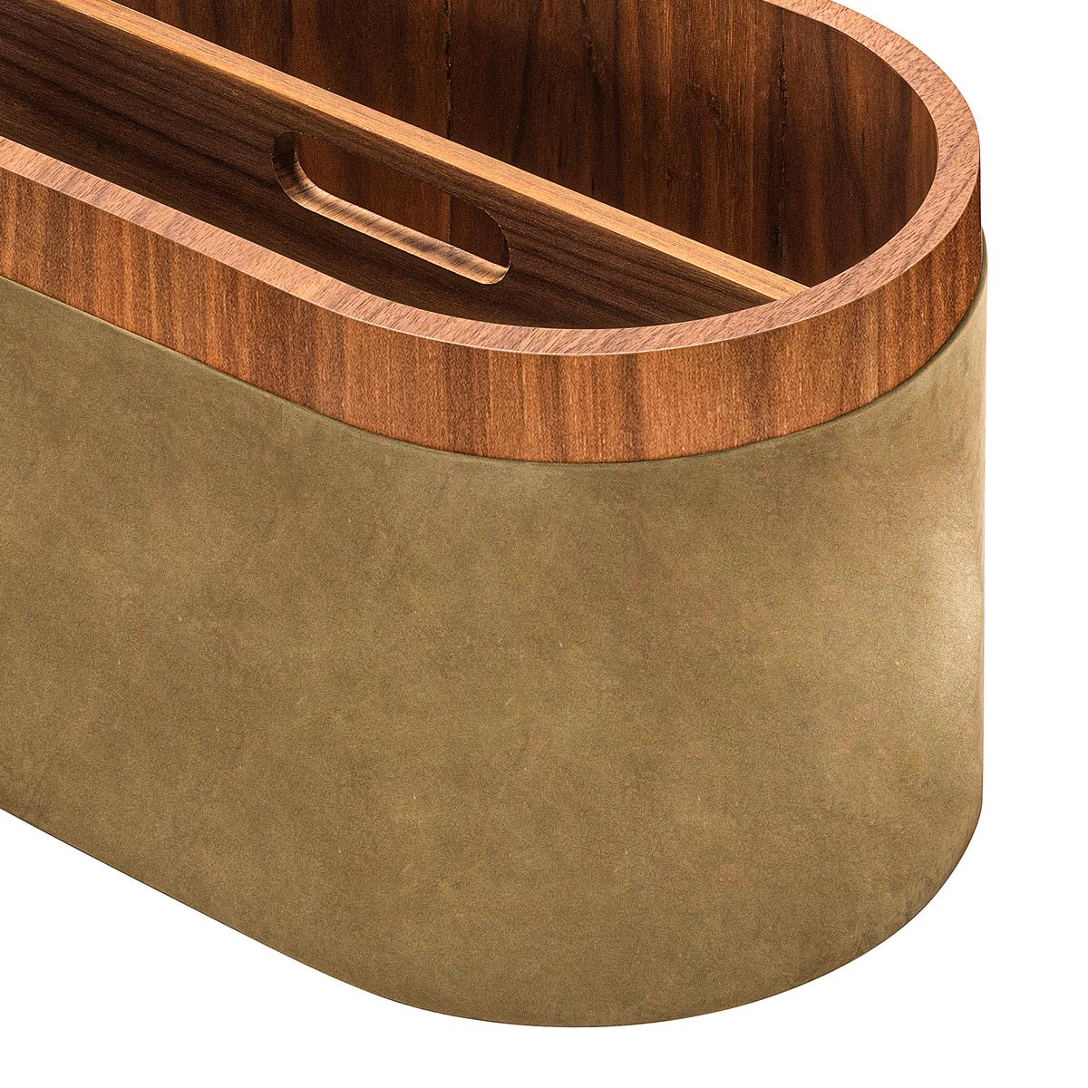 Die Kollektion "Dama" von Riviere vereint formale Strenge mit überraschenden Details und steht für italienische Handwerkskunst auf höchstem Niveau. Der Zeitschriftenhalter "Dama" präsentiert sich mit einem edlen Materialmix: außen feines khaki-farbenes Nubukleder, innen warmes Walnussholz und eine elegante Metalleinfassung aus Messing, die das Design perfekt abrundet.