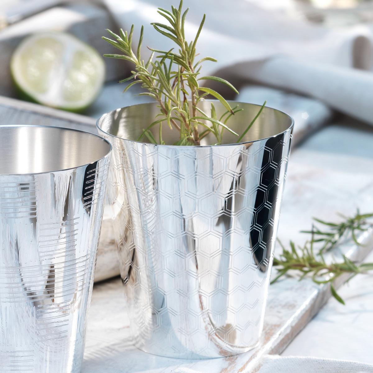 Neue Facetten für die Gin- und Wasserbecher "Dante" aus der Barkollektion von Robbe & Berking. Geometrische feine Linien zieren mit einem feinen "Rhombus"-Muster den Becher und sorgen im Zusammenspiel mit Licht und Schatten in jedem Umfeld für Glanzeffekte.