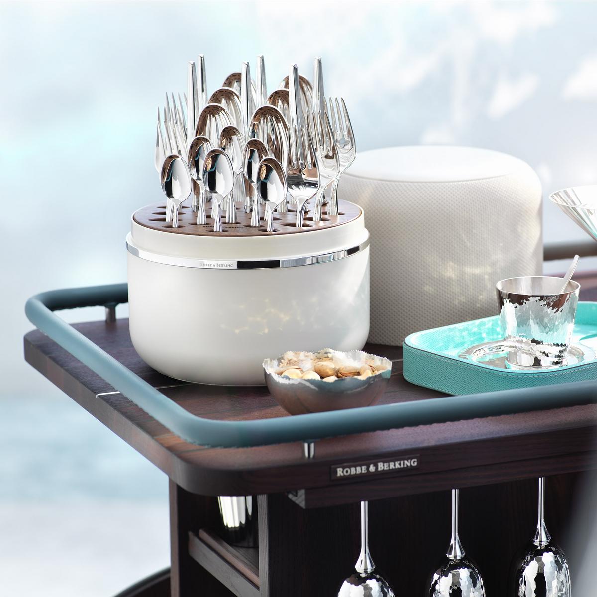 Essgewohnheiten finden zunehmend einen informellen neuen Chic. Raus aus der Schublade und rauf auf den Esstisch, wo das Leben spielt: "The Box Creme" von Robbe & Berking ist ein echtes Centrepiece und lädt zur Selbstbedienung ein.