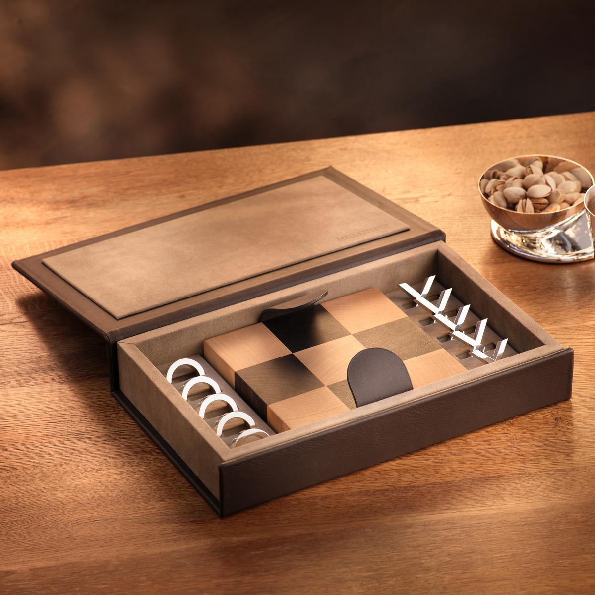 Das Spielfeld aus edlem Ahorn- und Wengéholz besticht durch seine klare Linienführung und die warme Haptik feinster Hölzer. Die versilberten Spielsteine, kunstvoll verarbeitet, setzen glänzende Akzente und bringen die legendäre Silberschmiedekunst von Robbe & Berking zum Ausdruck – seit 1874 in fünfter Generation gepflegt und international geschätzt.