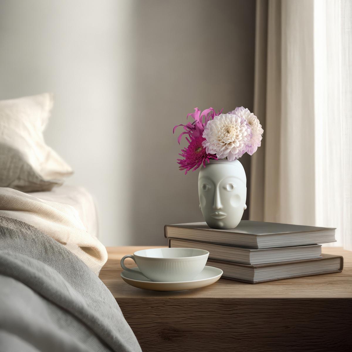 Gefertigt aus feinstem Porzellan und mit einer edlen, mattsatinierten Oberfläche versehen, wirken die Vasen besonders weich und elegant. Die satinierte Veredelung verleiht dem weißen Porzellan eine samtige Anmutung und bringt die fein ausgearbeiteten Gesichtszüge eindrucksvoll zur Geltung. Jede Vase trägt ein stilisiertes Reliefgesicht, das mit großer Sorgfalt modelliert wurde und den Designobjekten ihre individuelle Ausstrahlung verleiht.