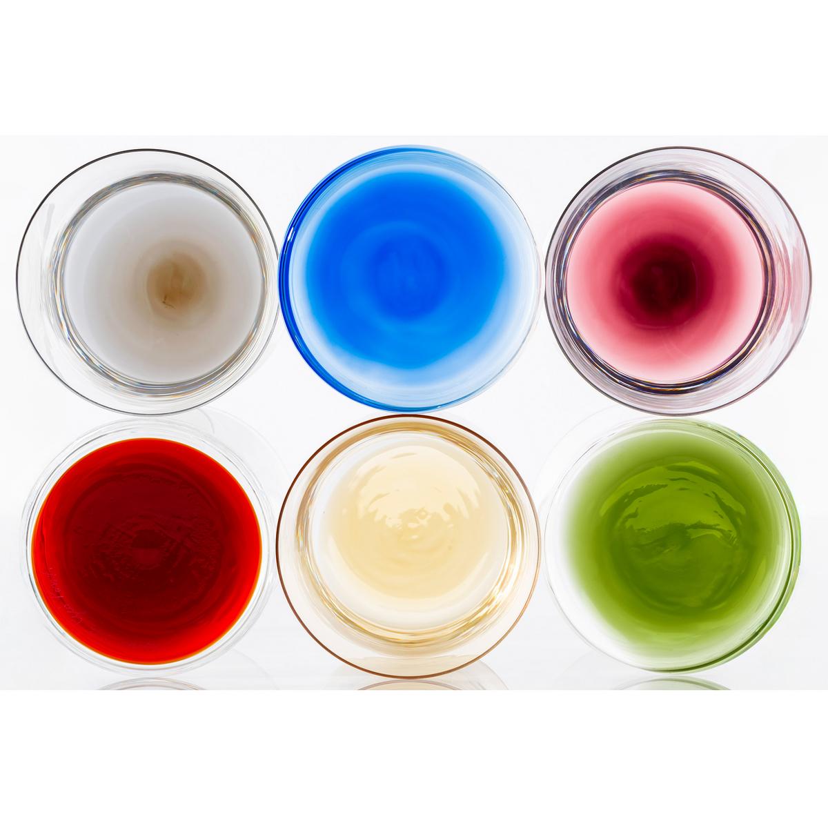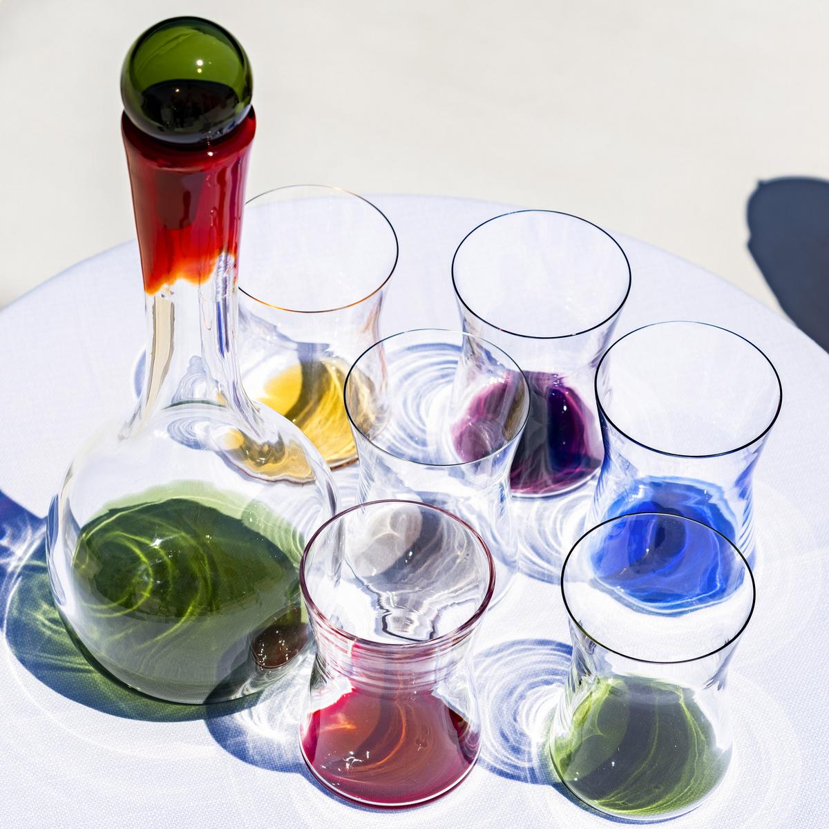 Das Design der Becher "Apem" ist eine genauestens austarierte Kombination aus Farbe und Form. Die Gläser haben in der Mitte eine leichte Verengung, die an eine Taille oder eine Sanduhr erinnert. Ihre Böden bestehen aus farbigem Glas, das sich im kristallklaren Muranoglas endlos widerspiegelt. Das Set aus sechs Bechern enthält die Farben Grau, Apfelgrün, Bernstein, Rot, Lila und Saphirblau. Als mundgeblasenes Unikat ist jeder Becher ein bisschen anders und reflektiert die Fähigkeiten der Glasbläser von Venini.