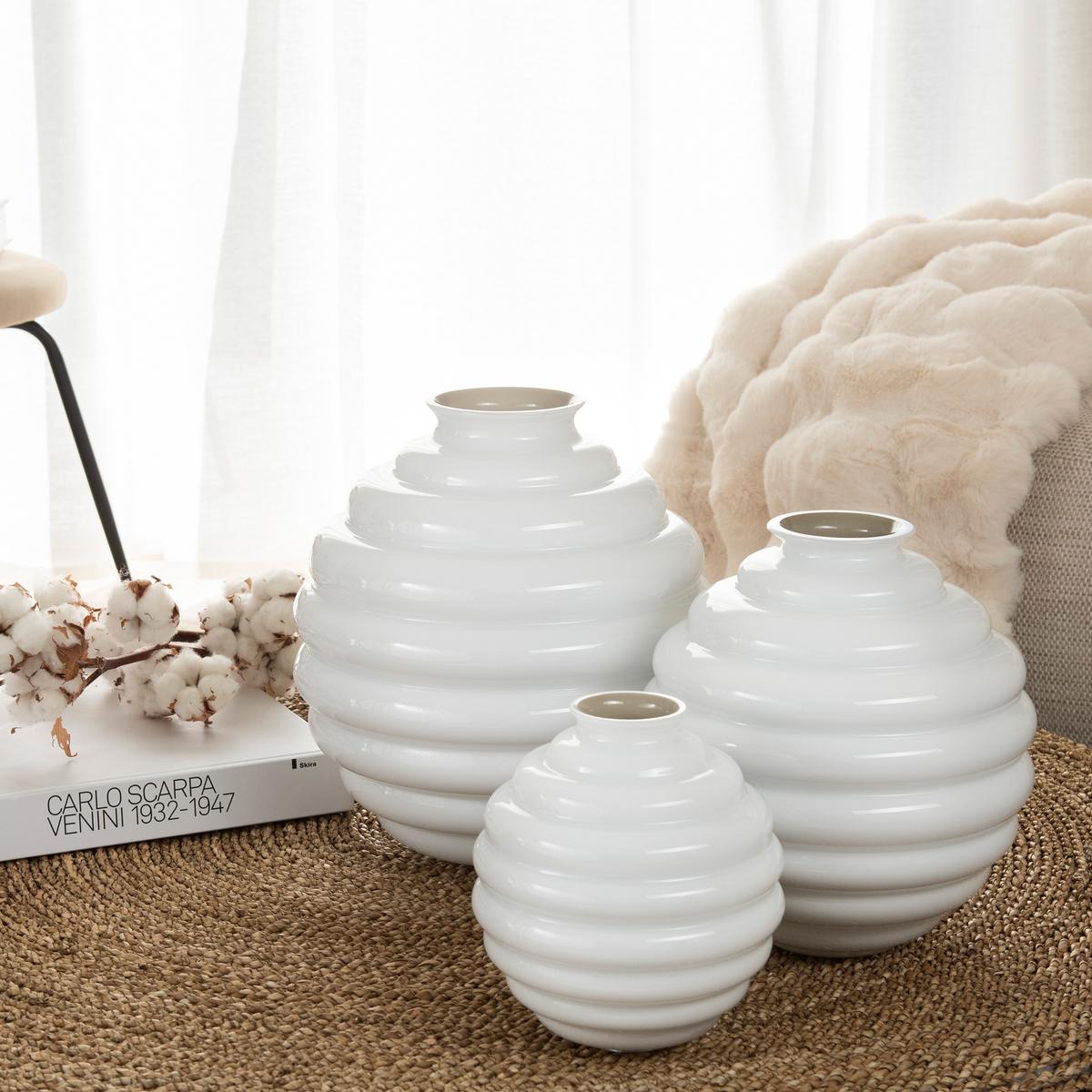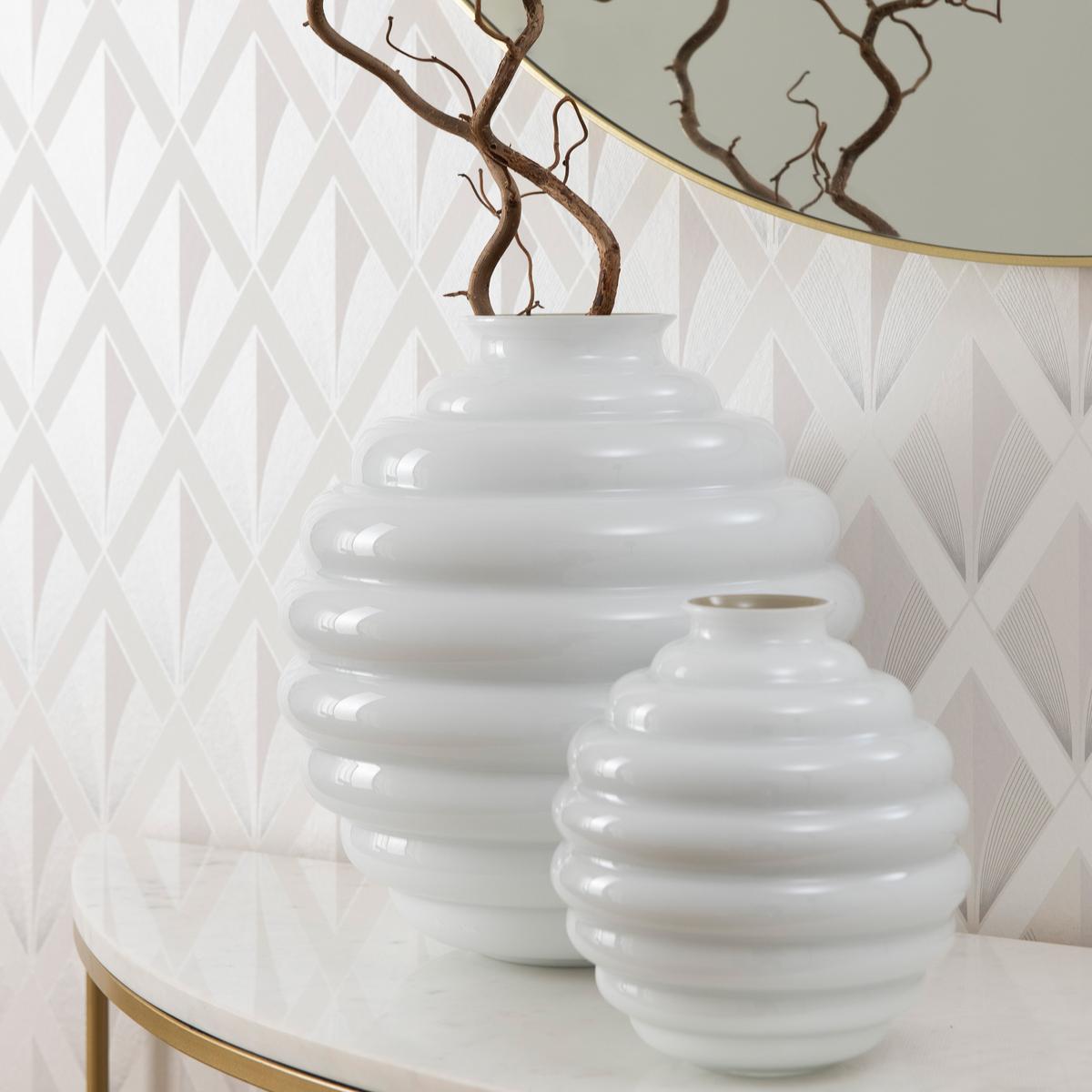 Die Vasen "Deco" von Venini gehen auf einen Entwurf aus dem Jahr 1930 zurück und sind von der klaren Formensprache des Art Déco geprägt. Ihre charakteristische Silhouette entsteht aus übereinanderliegenden, weich gerundeten Ringen, die sich rhythmisch nach oben entwickeln und der Vase eine skulpturale Präsenz verleihen.