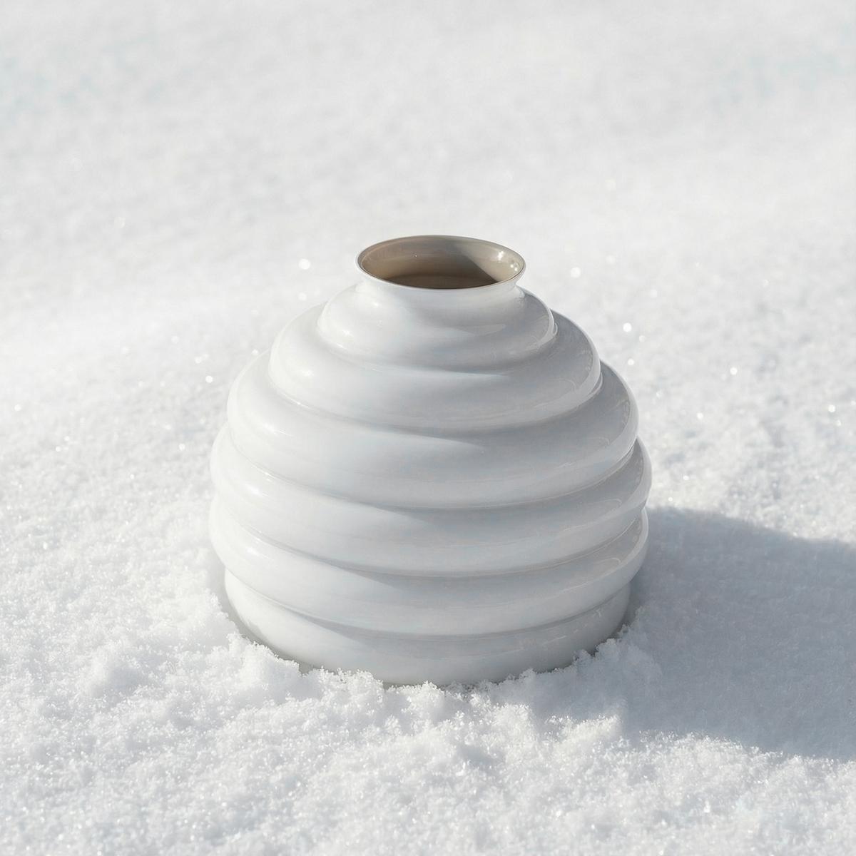 In der Ausführung "Snow" zeigt sich dieses ikonische Design in einer besonders eleganten und modernen Interpretation. Die Außenseite ist in opakem Weiß gehalten, während das Innere in einem warmen Taupe-Ton schimmert. Durch dieses Zusammenspiel entsteht ein faszinierender, sanft diffuser Farbeffekt, der an verschneite Landschaften erinnert und dem Objekt eine besondere Tiefe verleiht.