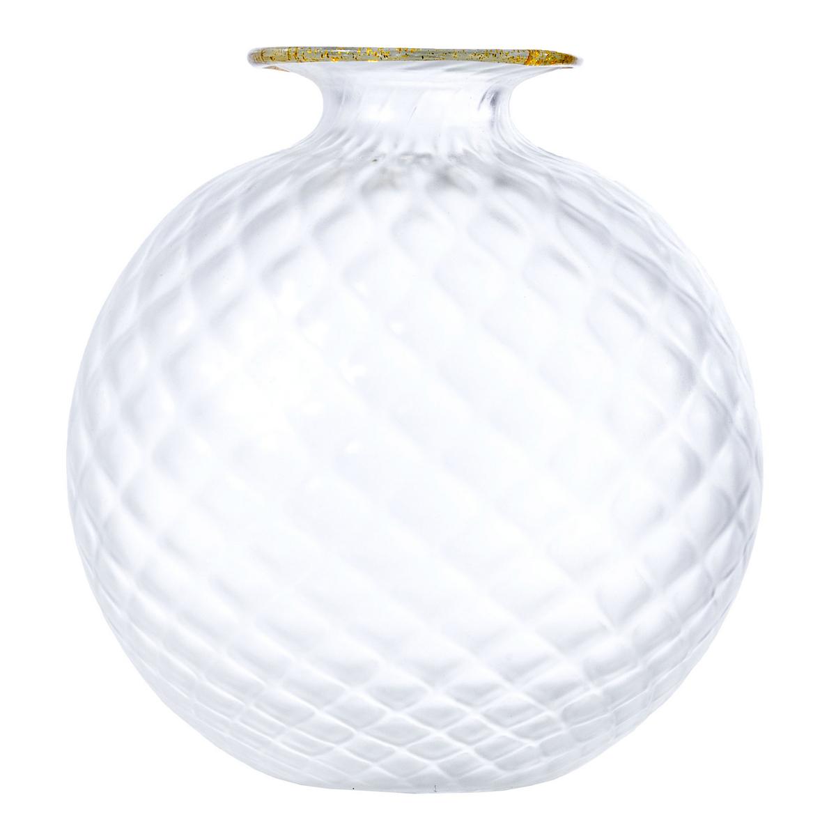 Glas so weich wie Schnee: Venini überzieht die Steppdecken-artige Oberfläche der Vasen "Monofiori Balloton Frozen Gold" mit einem seidig-matten Eis-Finish. So erhält die handgearbeitete Kugelvase eine mysteriöse Anmut, die an frischen Schnee auf einem vereisten See erinnert. Der breite Rand am schmalen Hals enthält feine Goldpartikel, die dem Design einen warmen Hauch verleihen. Der Name "Monofiori" ("Einzelblume") verrät, wie Sie die Vase am besten in Szene setzen: Präsentieren Sie darin eine einzelne große Blume oder einen zierlichen Ast für eine erhabene Wintereleganz. Die Vasen sind in verschiedenen Größen erhältlich.