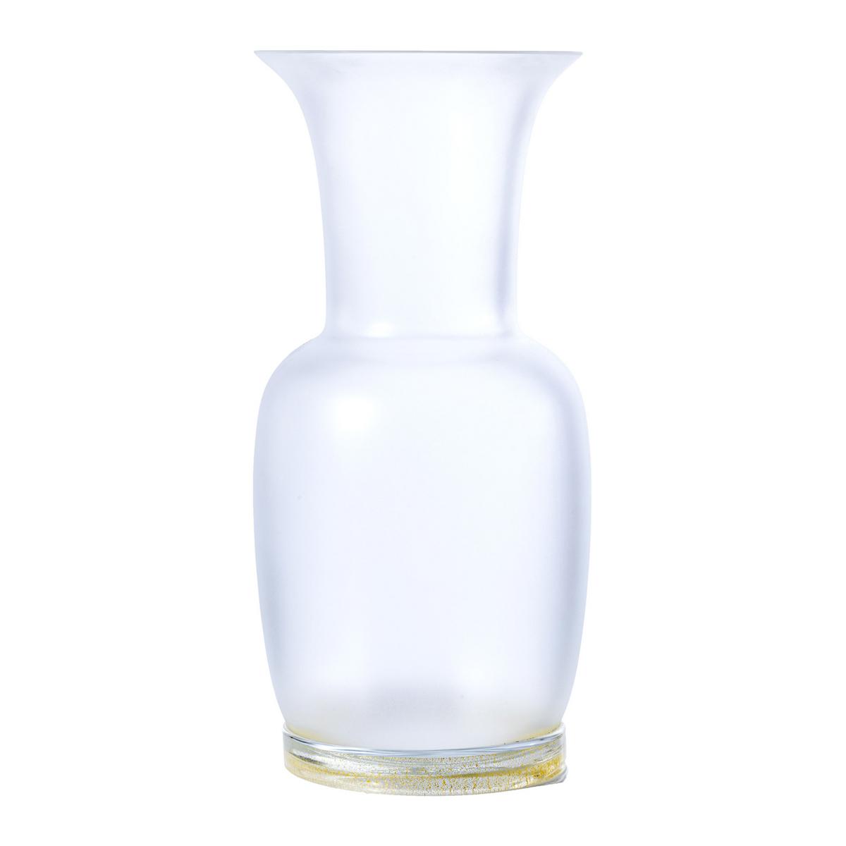 Der Klassiker im eisigen Gewand. Die Vasen "Opalino Frozen Gold" von Venini tauschen die Venini-typische Farbenpracht mit einem seidig-matten Finish, das wie Eis aussieht. Die "Opalino" Vasen tragen ihren Namen, weil sie in ihrer Urform von 1932 aus undurchsichtigem Milchglas ("Vetro opalino") bestehen. Die Frozen Edition ist aus klarem Muranoglas gefertigt, das mithilfe eines Sandstrahlers mit einer feinen Satin-Oberfläche veredelt wurde. Einfallendes Licht schimmert diffus durch die Trompetenvase wie durch natürlich entstandenes Eis. Der Fuß enthält feine Goldpartikel, die im Glas zu schweben scheinen. Die Vasen sind in verschiedenen Größen erhältlich.