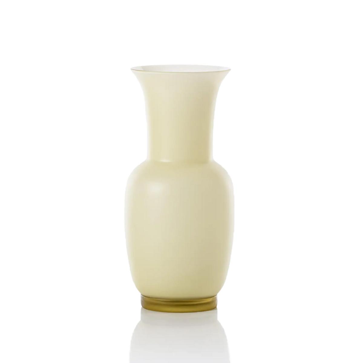 Entdecken Sie Muranoglas von seiner seidigen Seite. Venini verleiht den Vasen "Opalino" in der Farbe Strohgelb eine matte, sandgestrahlte Oberfläche für einen geheimnisvollen Glanz. Die Opalino Vasen haben eine weiße Innenseite, die den berühmten Venini Glasfarben ihre Brillanz verleiht. Venini fertigt die ikonischen Trompetenvasen in reiner Handarbeit auf der Insel Murano in der Lagune von Venedig. Die Farbe Strohgelb verleiht den Vasen einen natürlichen, zeitlosen Charakter.