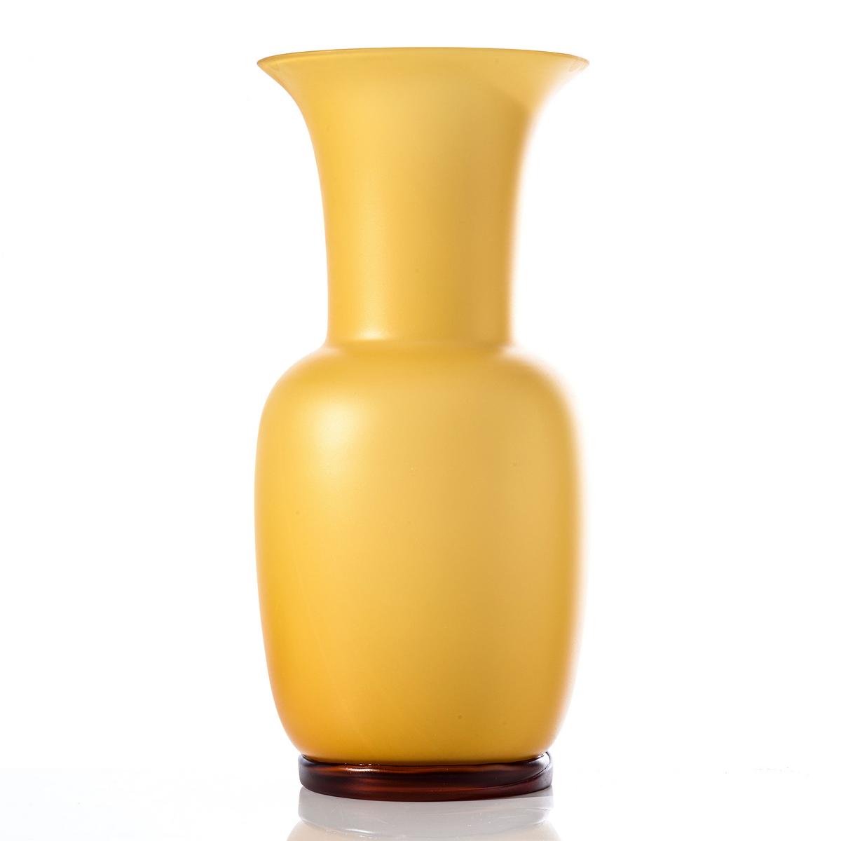 Entdecken Sie Muranoglas von seiner seidigen Seite. Venini verleiht den Vasen "Opalino" in der Farbe Ambra eine matte, sandgestrahlte Oberfläche für einen geheimnisvollen Glanz. Die Opalino Vasen haben eine weiße Innenseite, die den berühmten Venini Glasfarben ihre Brillanz verleiht. Venini fertigt die ikonischen Trompetenvasen in reiner Handarbeit auf der Insel Murano in der Lagune von Venedig. Die Bernstein-Farbe Ambra verleiht den Vasen einen leuchtenden, extravaganten Charakter.