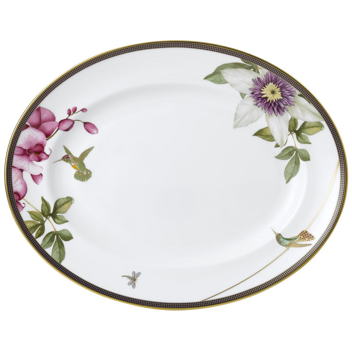 Tauchen Sie ein in die Welt der exotischen Blumen und feenhaften Kreaturen mit dem wunderschönen Geschirr "Hummingbird" von Wedgwood. Aus seidig weißem Fine Bone China gefertigt, sind alle Einzelteile mit einer Mischung aus überdimensionalen exotischen Blüten und verspielten Kolibris verziert.