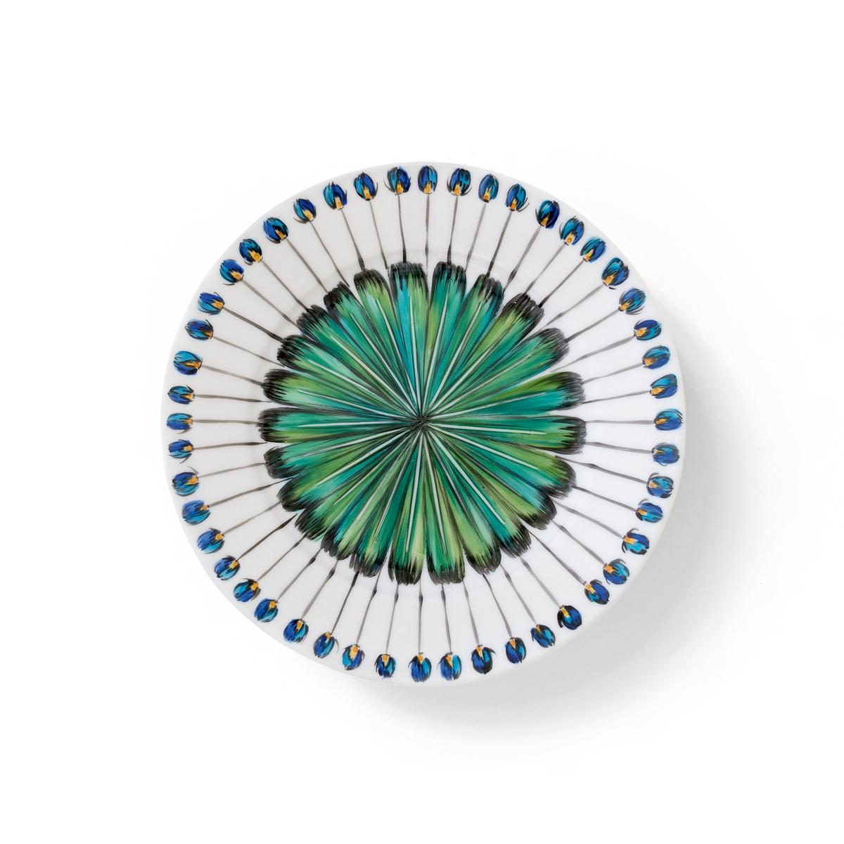 "Sammlerstück: Ein Blickfang auf jeder Tafel ist dieser Platzteller aus der Bahia-Serie von Alberto Pinto. Als handgearbeitetes Unikat aus Limoges-Porzellan gefertigt, ist er in sieben verschiedenen Farben erhältlich. Die bunt-irisierenden Farben des Feder-Dekors sind eine Ode an Brasilien und den Kopfschmuck der Ureinwohner. Die Kollektion umfasst auch Essteller, Brot- und Dessertteller."