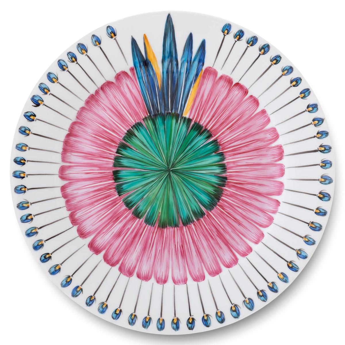 "Sammlerstück: Ein Blickfang auf jeder Tafel ist dieser Platzteller aus der Bahia-Serie von Alberto Pinto. Als handgearbeitetes Unikat aus Limoges-Porzellan gefertigt, ist er in sieben verschiedenen Farben erhältlich. Die bunt-irisierenden Farben des Feder-Dekors sind eine Ode an Brasilien und den Kopfschmuck der Ureinwohner. Die Kollektion umfasst auch Essteller, Brot- und Dessertteller."