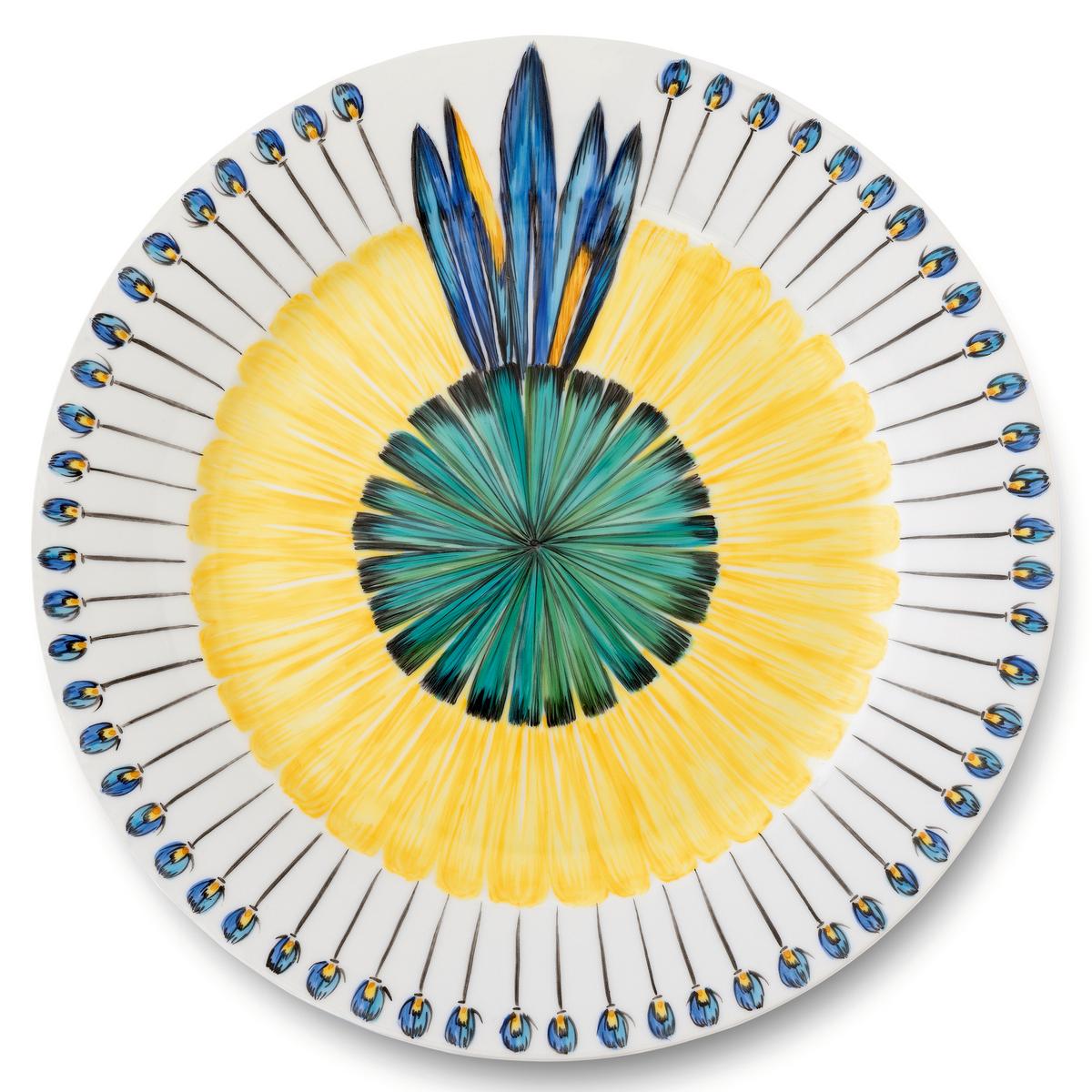 "Sammlerstück: Ein Blickfang auf jeder Tafel ist dieser Platzteller aus der Bahia-Serie von Alberto Pinto. Als handgearbeitetes Unikat aus Limoges-Porzellan gefertigt, ist er in sieben verschiedenen Farben erhältlich. Die bunt-irisierenden Farben des Feder-Dekors sind eine Ode an Brasilien und den Kopfschmuck der Ureinwohner. Die Kollektion umfasst auch Essteller, Brot- und Dessertteller."