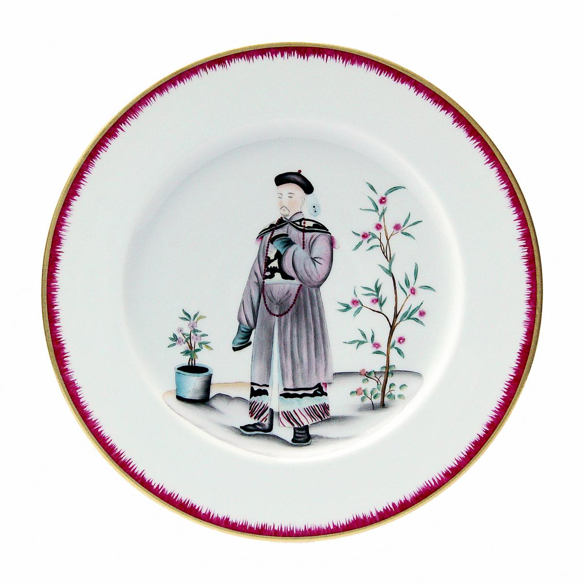 Die Platzteller und Essteller "Chinoiserie" von Alberto Pinto aus Limoges-Porzellan zeigen sechs verschiedene folkloristische Dekore. Kaffee- und Teeservice variieren Ornamente und kleinformatige Motive der chinesischen Kunst.