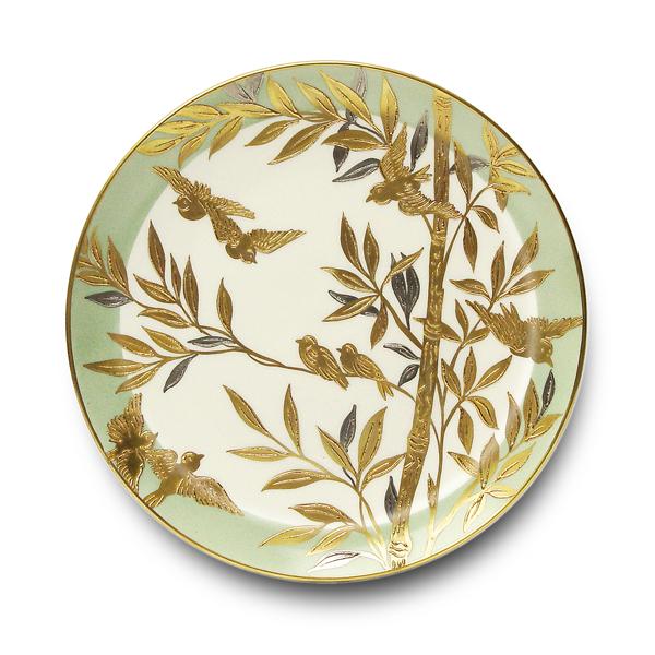 "Im asiatischen Dekor. Die handgemalten Vögel- und hellen Blattmotive in Gold, Platin und Seladongrün sind die Kreationen des französischen Designers Alberto Pinto."