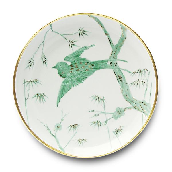 "Im asiatischen Dekor. Die handgemalten Vögel- und hellen Blattmotive in Gold, Platin und Seladongrün sind die Kreationen des französischen Designers Alberto Pinto."