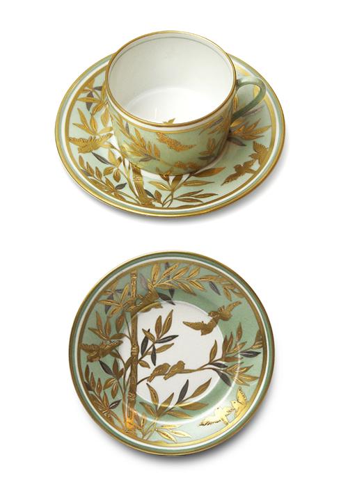 "Kaffee oder Tee? Das handbemalte Limoges-Porzellan mit Bambusmotiven aus Gold und Platin serviert beides bravourös. Passende Teller und Tassen hat Designer Alberto Pinto ebenfalls entworfen."