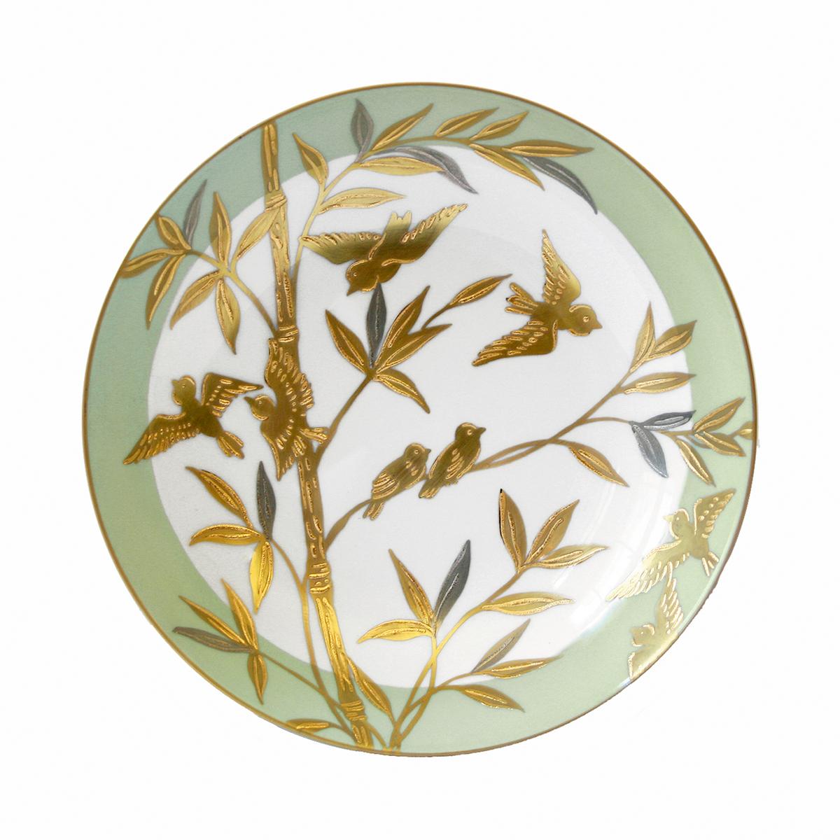 "Im asiatischen Dekor. Die handgemalten Vögel- und hellen Blattmotive in Gold, Platin und Seladongrün sind die Kreationen des französischen Designers Alberto Pinto."