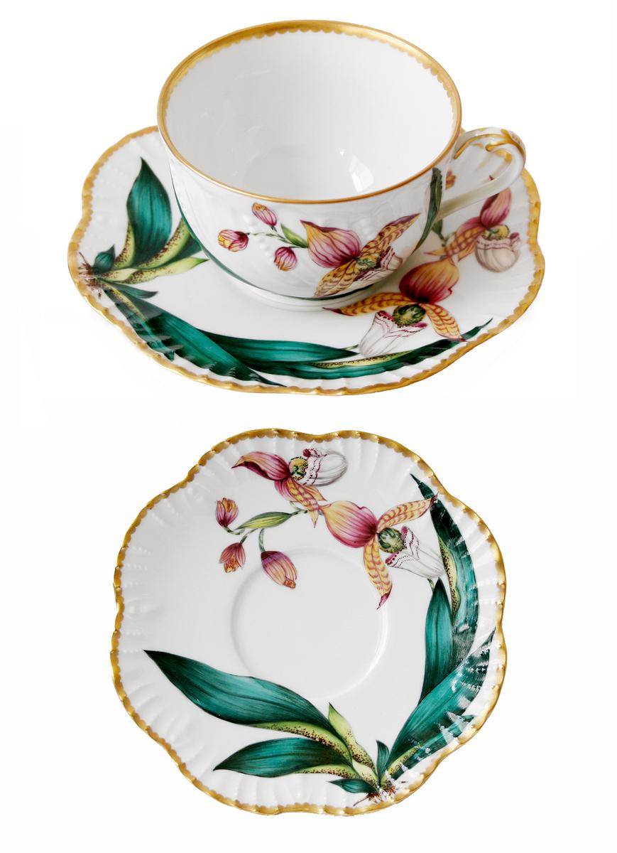 "Die grazilen Frauenschuh-Orchideen des französischen Designers Alberto Pinto erinnern an Bilder aus alten Botanikbüchern. Das kostbare Porzellan ist handbemalt und mit Goldrand veredelt."
