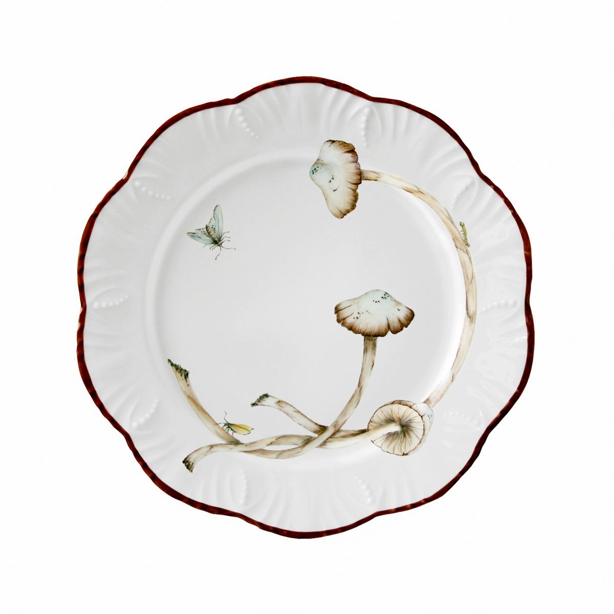 Neben dem Solo für jeweils einen Pilz auf den Esstellern zieren die Dessertteller und Suppenteller "Les Champignons" von Alberto Pinto jeweils mehrere Waldfrüchte. Auf dem Desserteller des Tafelservices aus Limoges-Porzellan räkeln sich drei zarte Helmlinge. Und auf dem tiefen Teller "Les Champignons" von Alberto Pinto ranken sechs reizvoll inszenierte Pilze aus der Art der Nelkenschwindlinge.