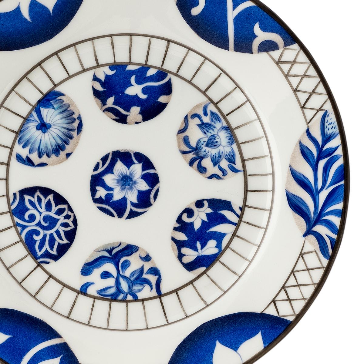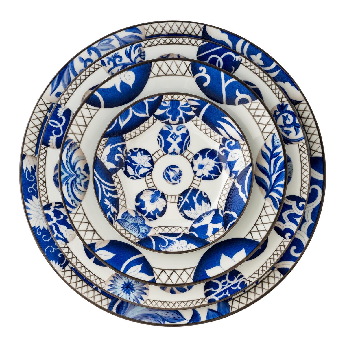 Mit "Shanghai" hat der Designer Alberto Pinto ein klassisches, blau-weißes chinesisches Service auf moderne Art und Weise interpretiert. Perfekte, architektonische Linien ergeben mehrere Kreise oder Halbkreise. In jedem Kreis befindet sich ein anderes, typisch chinesisches Porzellan-Motiv – hier eine wunderschöne Lotusblüte, dort eine sich öffnende Pfingstrose. Schattierungen in intensiven Blautönen verleihen den Tellern "Shanghai" von Alberto Pinto eine ganz besondere Farbbrillanz.