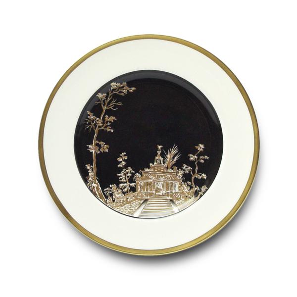 "Ein Königspalast sowie Baumsilhouetten schmücken das handbemalte Limoges-Porzellan Vieux Kyoto von Alberto Pinto."