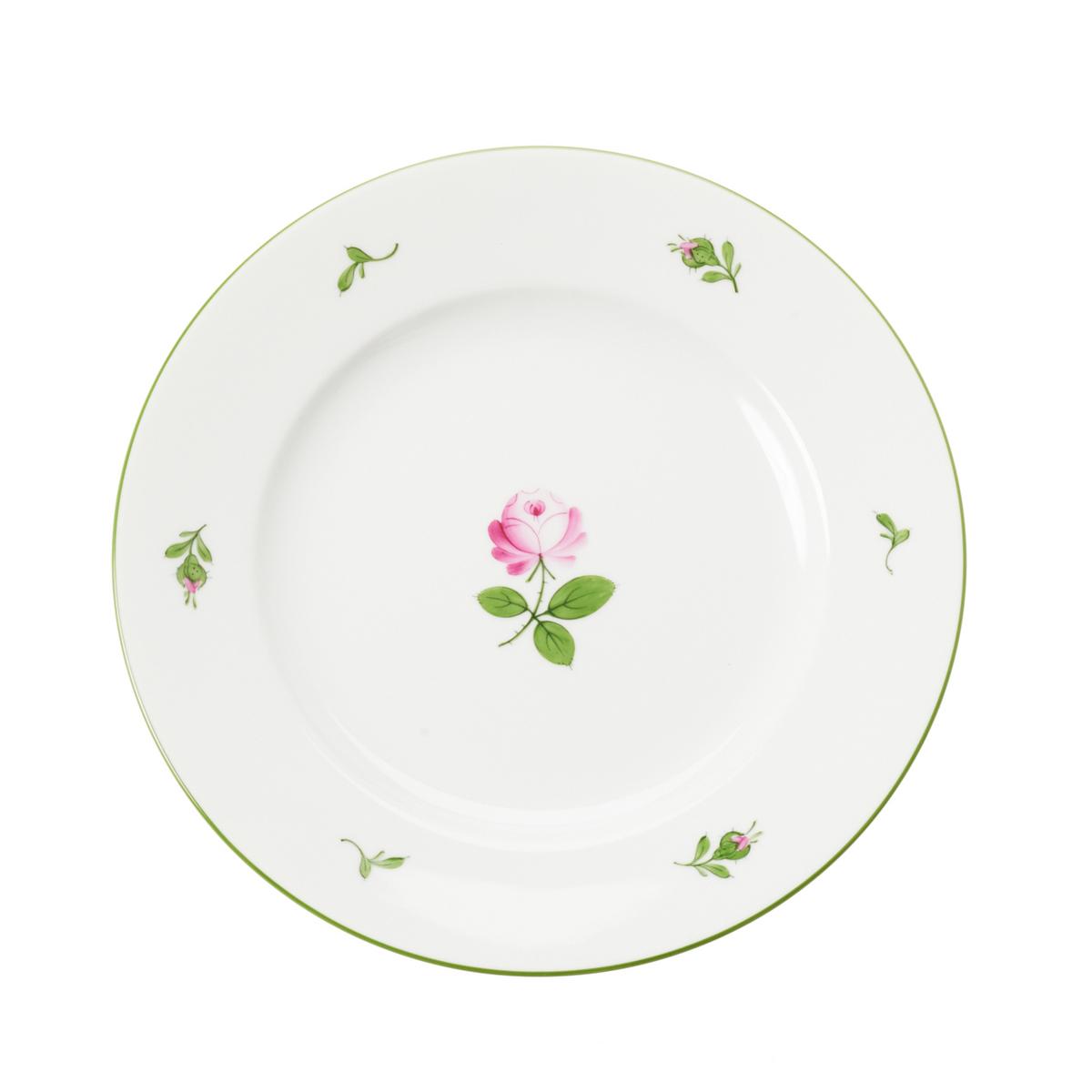 Die "Wiener Rose" mit grünem Rand, umrahmt von Knospen und Blattstreuern, zählt zu den beliebtesten Motiven der Einzelblumenserie aus der Porzellanmanufaktur Augarten Wien. Dieses beliebte Porzellanservice entstand bereits im Jahr 1924.