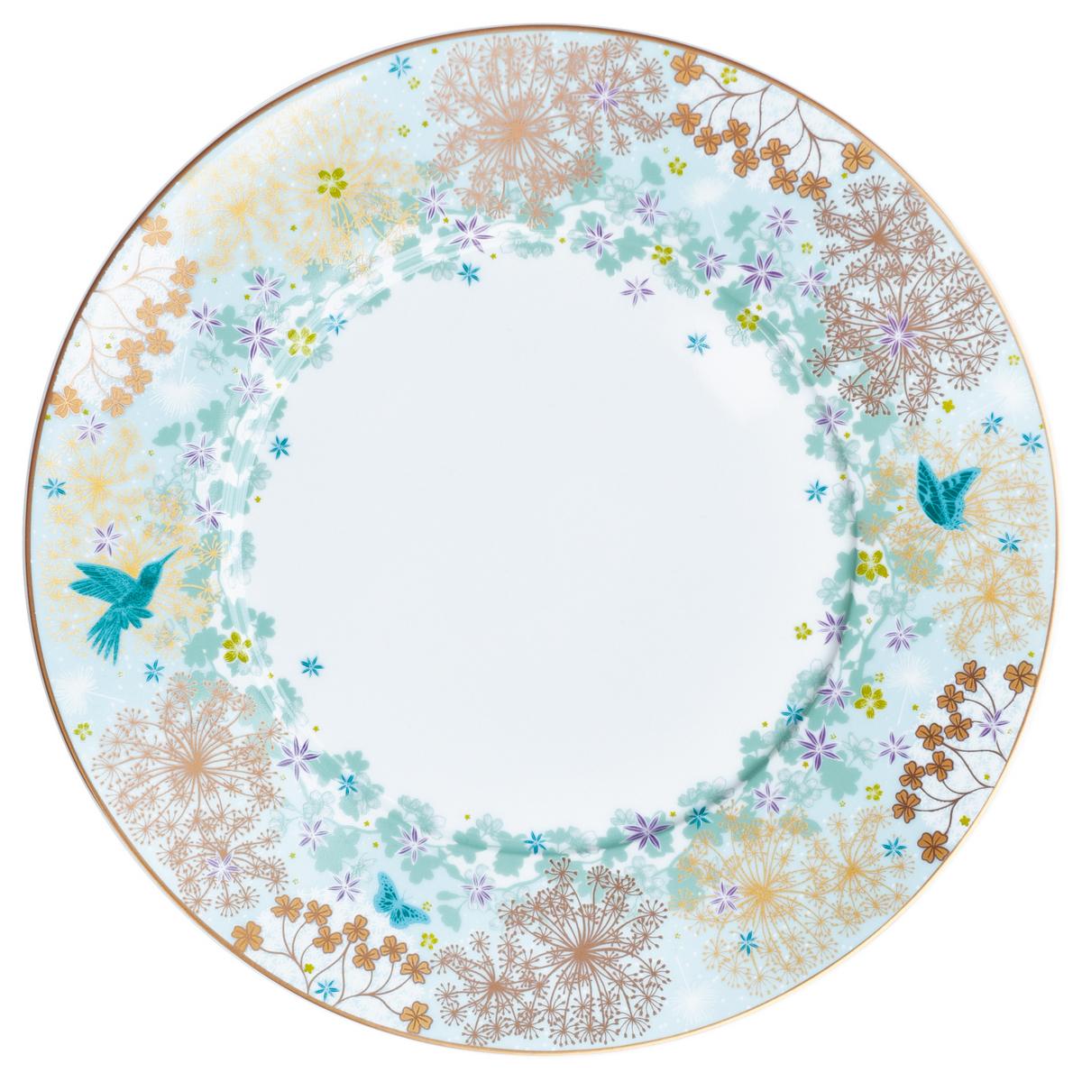 Bei dem Tafelservice "Féerie" von Bernardaud ziert das strahlend weiße Limoges-Porzellan ein Design des französischen Künstlers Michaël Cailloux. Das Blätter- und Blumendesign ist in zarten Türkis-, Lilatönen gehalten und mit wunderschönem Gold veredelt. Kolibris und Schmetterlinge gesellen sich zu Löwenzahnblüten, Kleeblumen und Kirschblüten. Diese Kombination verleiht dem Service eine lebendige Austrahlung. Für die Zusammenarbeit mit Bernardaud wollte der Künstler so wörtlich ein "himmlisch zartes aber gleichzeitig auch ausdrucksstarkes Dekor schaffen, welches eine Explosion an Mustern zeigt, ähnlich einem Feuerwerk" - dies ist ihm in jedem Fall gelungen.
