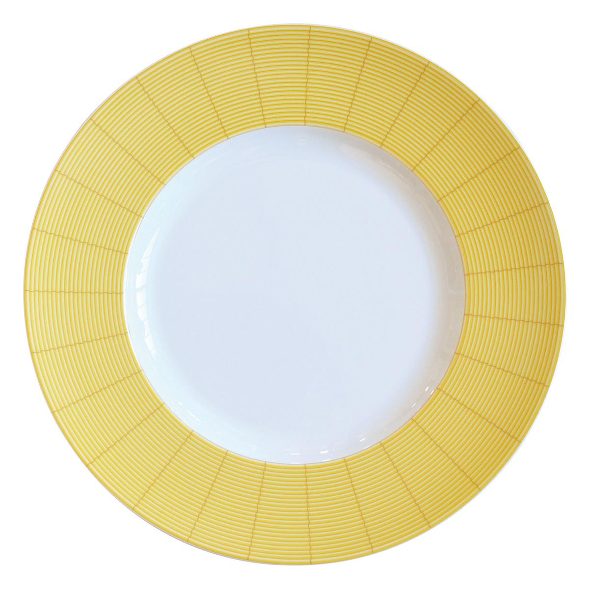 Die zarten Blätter und Blumen sind in gedeckten Grüntönen, Currygelb und warmen Rottönen gehalten. Die Teller des Tafelservices "Jardin Indien" von Bernardaud werden von einem goldgelben Rand eingerahmt. Jedes Element ist aus feinstem Limoges-Porzellan gefertigt.