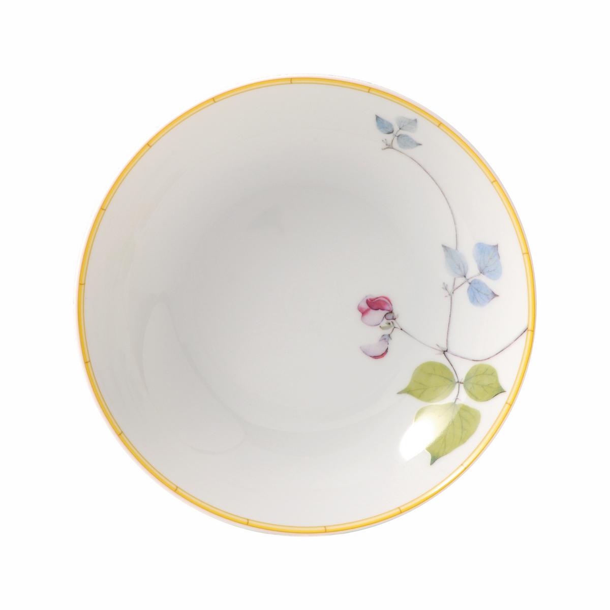 Die zarten Blätter und Blumen sind in gedeckten Grüntönen, Currygelb und warmen Rottönen gehalten. Die Teller des Tafelservices "Jardin Indien" von Bernardaud werden von einem goldgelben Rand eingerahmt. Jedes Element ist aus feinstem Limoges-Porzellan gefertigt.