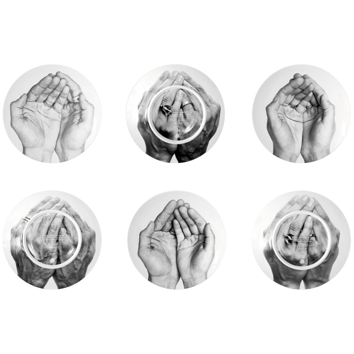 Die jeweilige Vorderseite zeigt das Innere zwei zu einer Schale geformten Hände. Die Rückseite der Teller zeigt auch die Rückseite der Hände. Doch müssen nicht alle am Tisch aus der gleichen Hand essen: Das Set "Je te mangerais dans la main" von Bernardaud besteht aus insgesamt sechs unterschiedlichen Motiven. Mal sind die Hände groß und kräftig, mal fast zart und filigran.