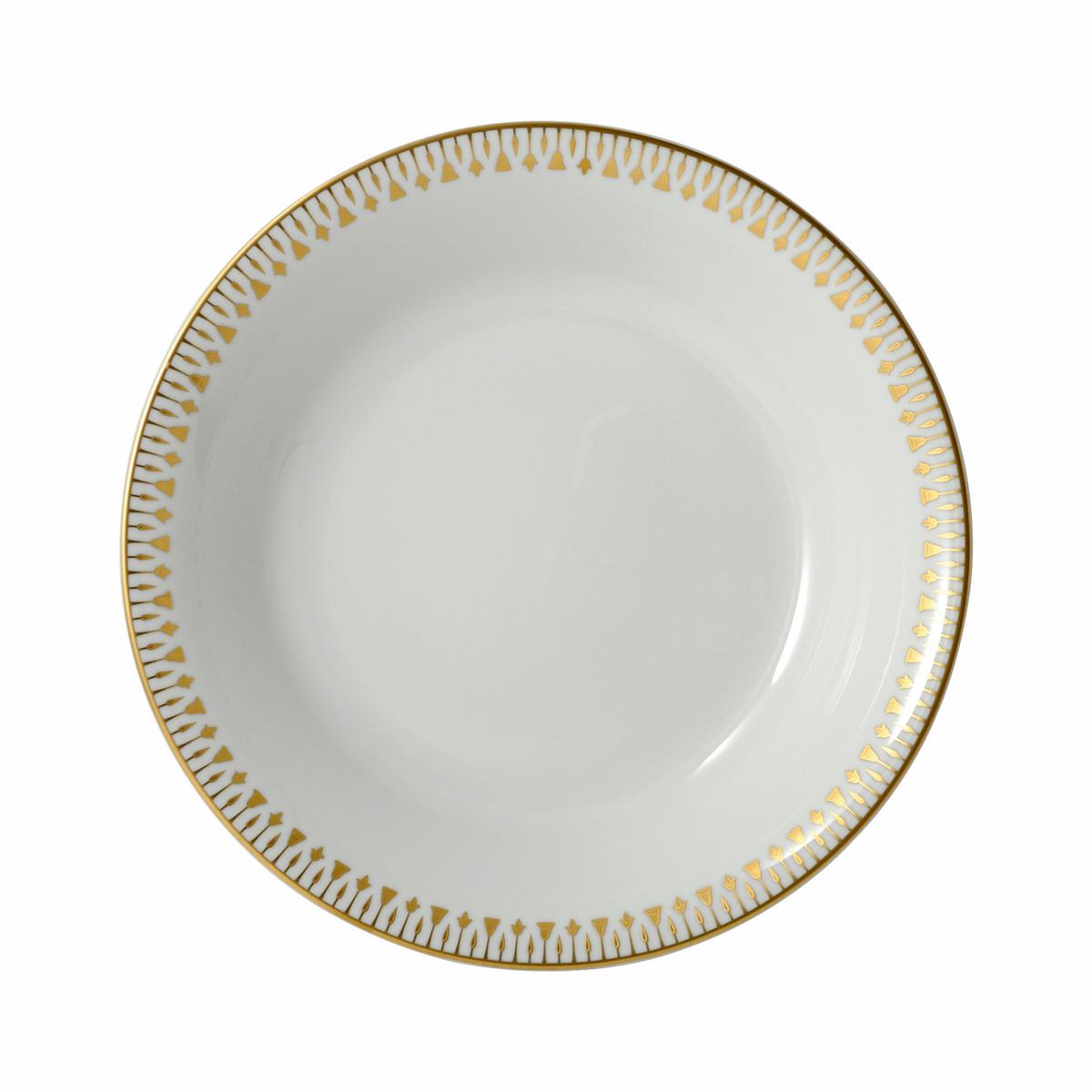 Goldene Strahlen schmücken das Tafelservice "Soleil Levant" von Bernardaud. Vor allem bei den großen, runden Tellern erkennt man, die Inspiration hinter diesem reich verzierten Service: Die aufgehende Sonne. Besonders wirkungsvoll ist deshalb auch die Kombination der weiß-goldenen Essteller des Tafelservices "Soleil Levant" von Bernardaud mit farbigen Desserttellern. Sie wirken wie ein zart gefärbtes Stück Himmel — in Altrosé, Violett, Honiggelb oder Chocolat.