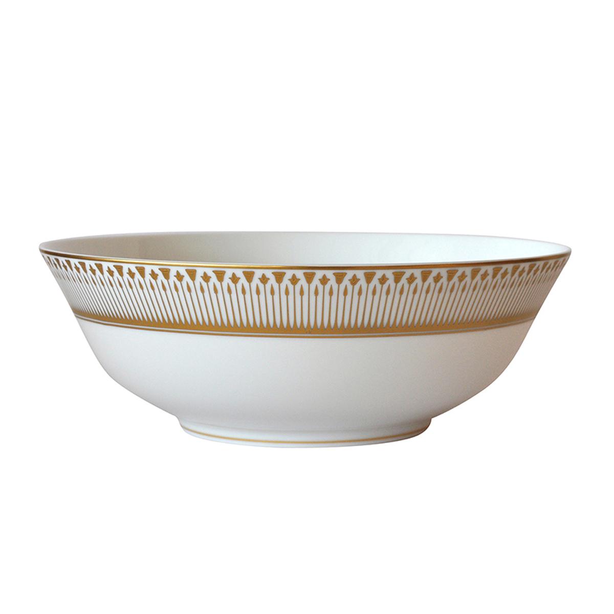 Goldene Strahlen schmücken das Tafelservice "Soleil Levant" von Bernardaud. Vor allem bei den großen, runden Tellern erkennt man, die Inspiration hinter diesem reich verzierten Service: Die aufgehende Sonne. Besonders wirkungsvoll ist deshalb auch die Kombination der weiß-goldenen Essteller des Tafelservices "Soleil Levant" von Bernardaud mit farbigen Desserttellern. Sie wirken wie ein zart gefärbtes Stück Himmel — in Altrosé, Violett, Honiggelb oder Chocolat.