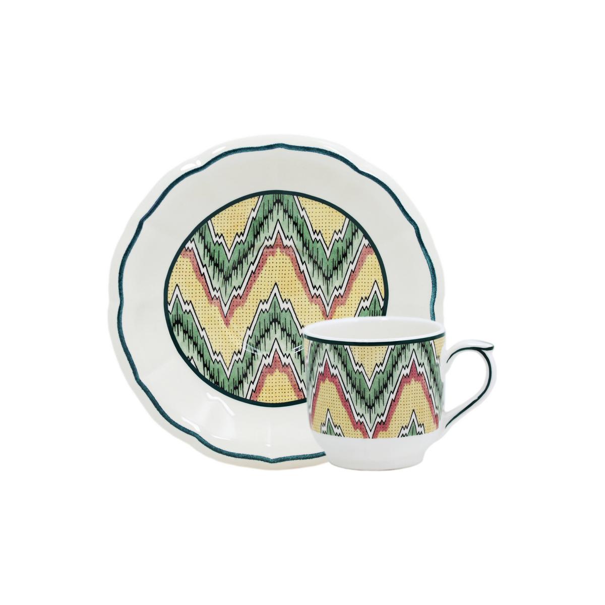 Das Tafelservice "Dominoté" von Gien entstand aus der Zusammenarbeit von Gien und einer kleinen Tapetenmanufaktur "Antoinette Poisson", die nach dem Verfahren aus dem 18. Jahrhundert handbedruckte und handbemalte Tapetenblätter "Dominoté" herstellt.