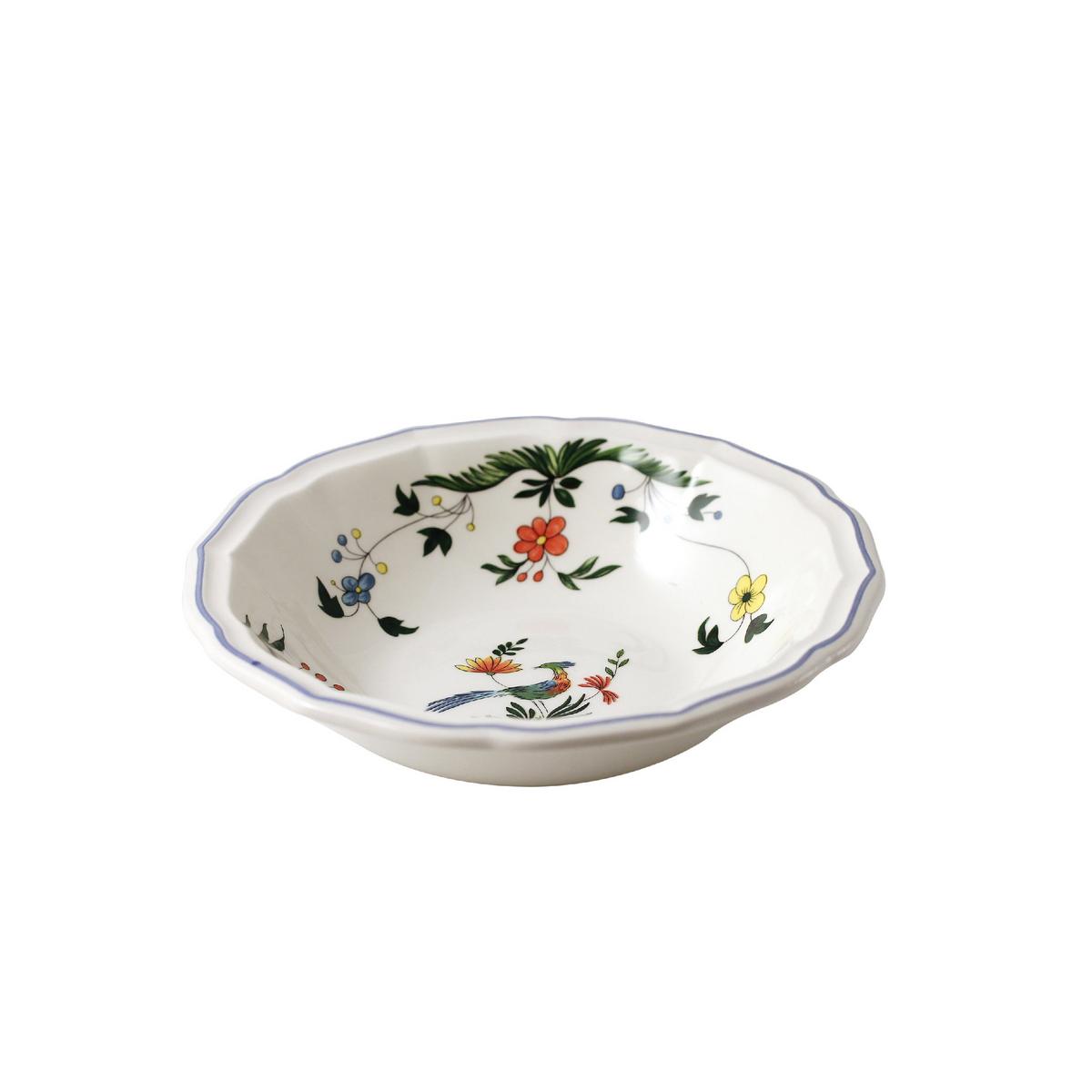 Einen eleganten Rahmen für diesen exotischen Garten formt der sanft geschwungene wellenförmige Rand der Teller und Schüsseln "Oiseaux de Paradis". Um dessen anmutige Geometrie zu betonen, verzieren die Kunsthandwerker aus Gien an der Loire diese Linie mit einem schmalen blauen Rand. Klassischer Landhausstil mit einem Hauch Exotik.