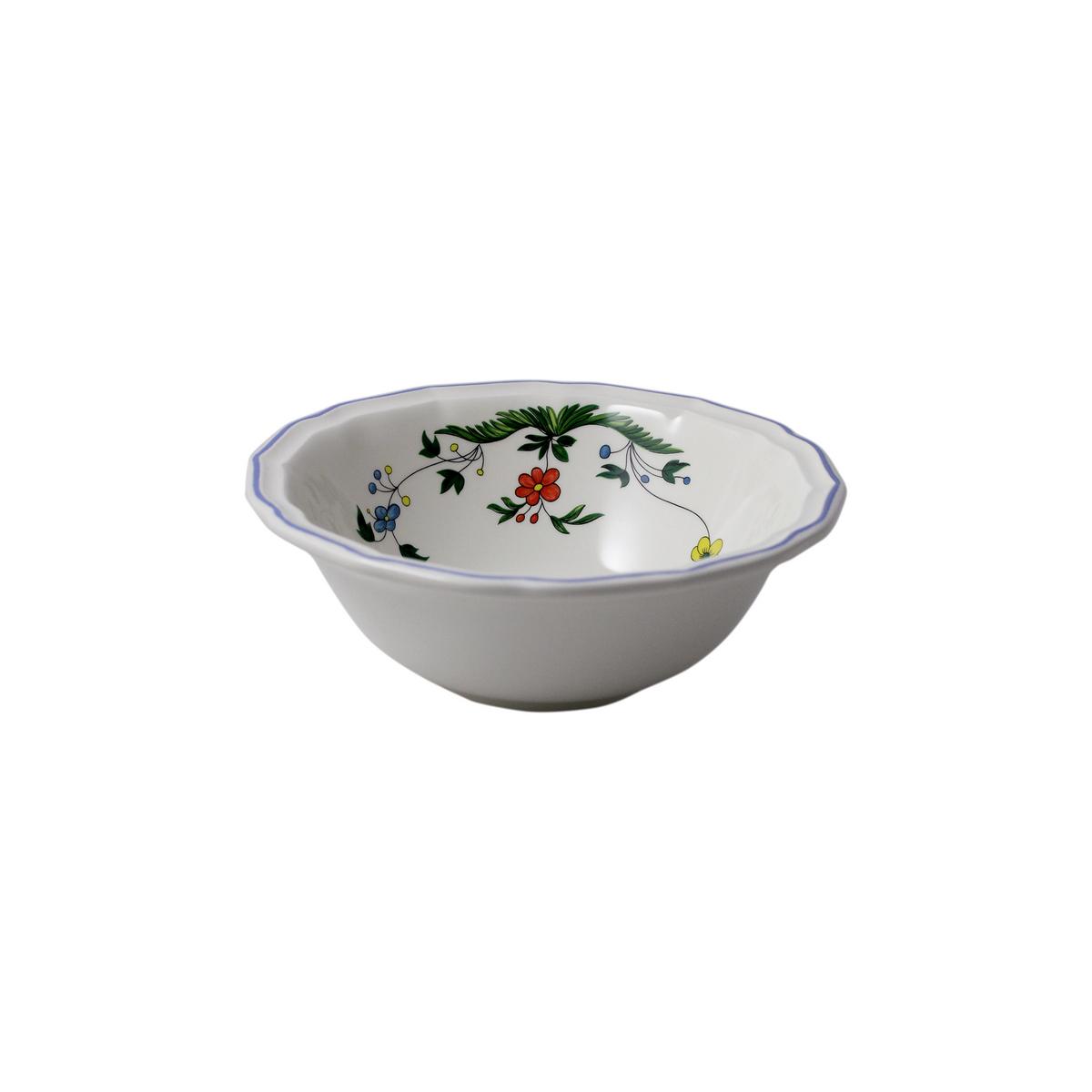 Einen eleganten Rahmen für diesen exotischen Garten formt der sanft geschwungene wellenförmige Rand der Teller und Schüsseln "Oiseaux de Paradis". Um dessen anmutige Geometrie zu betonen, verzieren die Kunsthandwerker aus Gien an der Loire diese Linie mit einem schmalen blauen Rand. Klassischer Landhausstil mit einem Hauch Exotik.