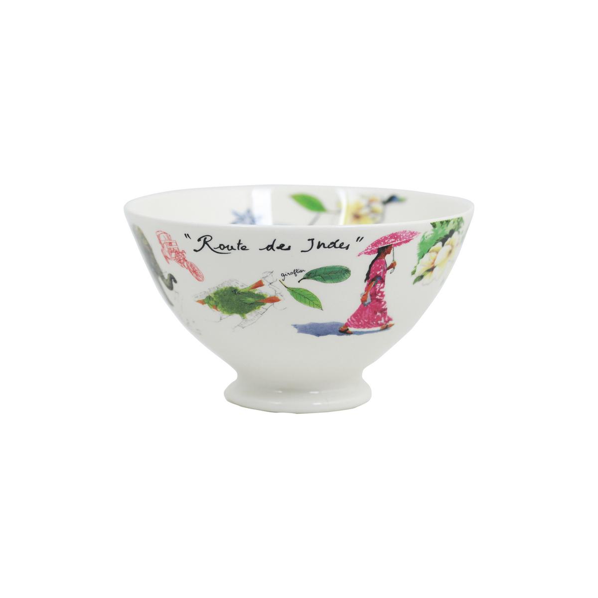 Das Dekor ist ein Entwurf des weit gereisten Malers Arnaud d'Aunay, der wie in einem Skizzenbuch, bunte Farbtupfer und Symbole der facettenreichen indischen Kultur auf die ecrufarbene Fayence gezaubert hat.