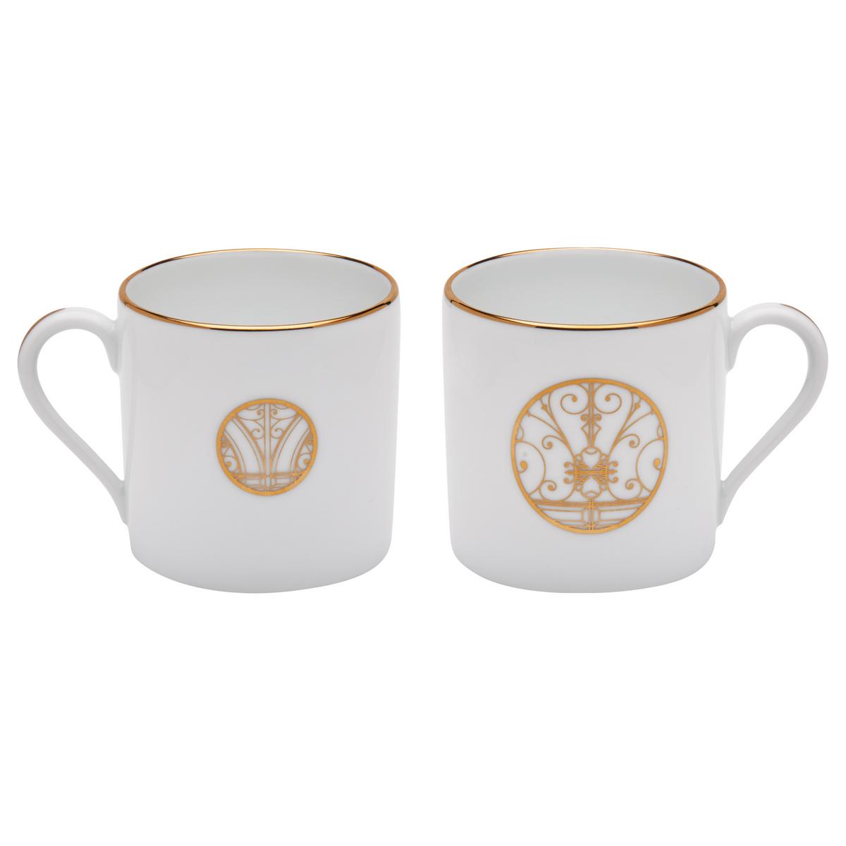 Mit den Mini-Henkelbechern aus Limoges-Porzellan schuf Haviland die perfekten Tassen, um ein köstliches Mahl mit einem Kaffee oder Espresso zu krönen. Jede Tasse ist an Vorder- und Rückseite mit zwei unterschiedlichen kreisförmigen Dekoren verziert. Diese Rosetten sind in Gold oder Platin eingerahmt und zeigen Vergrößerungen bekannter Designs der Porzellanmanufaktur Haviland.