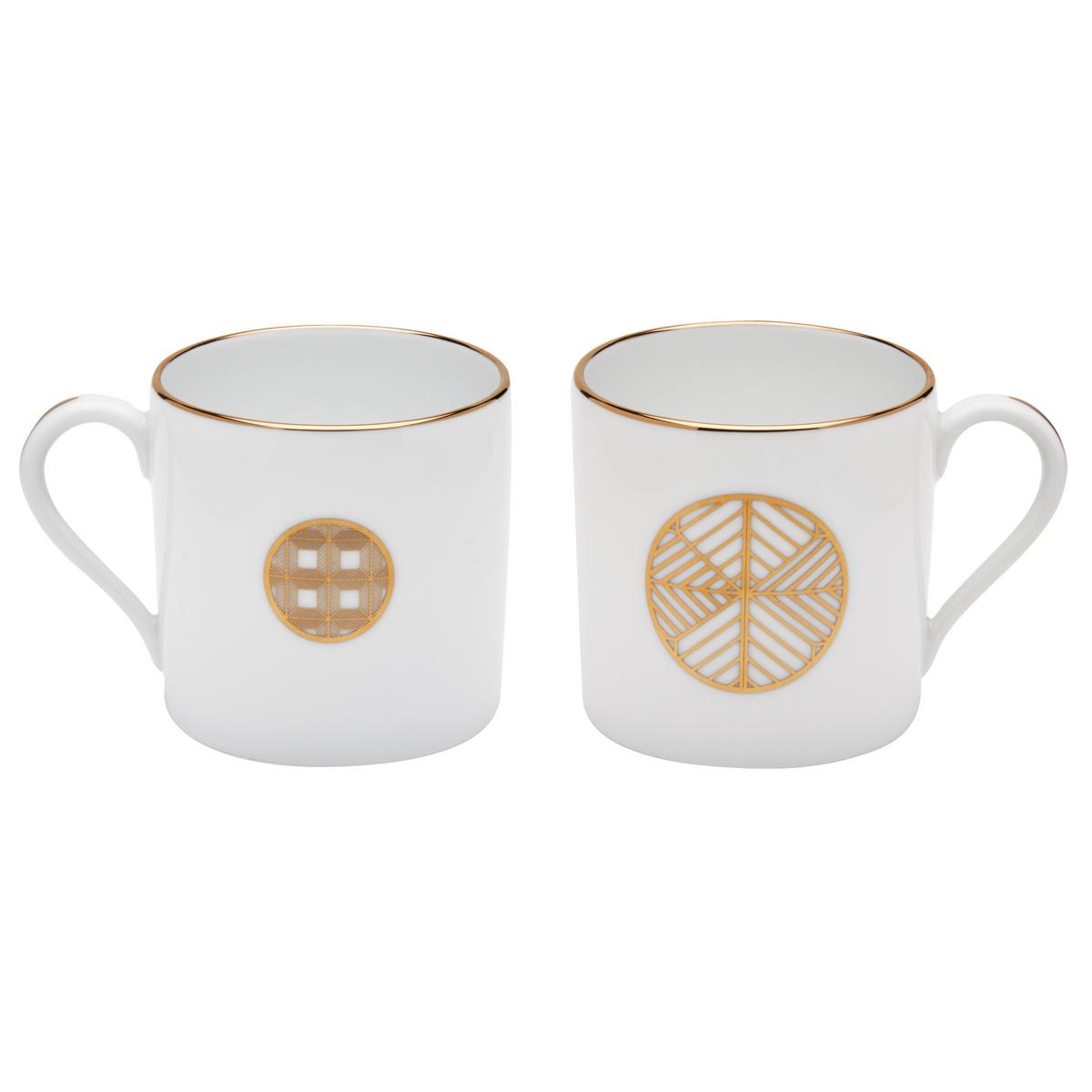 Mit den Mini-Henkelbechern aus Limoges-Porzellan schuf Haviland die perfekten Tassen, um ein köstliches Mahl mit einem Kaffee oder Espresso zu krönen. Jede Tasse ist an Vorder- und Rückseite mit zwei unterschiedlichen kreisförmigen Dekoren verziert. Diese Rosetten sind in Gold oder Platin eingerahmt und zeigen Vergrößerungen bekannter Designs der Porzellanmanufaktur Haviland.