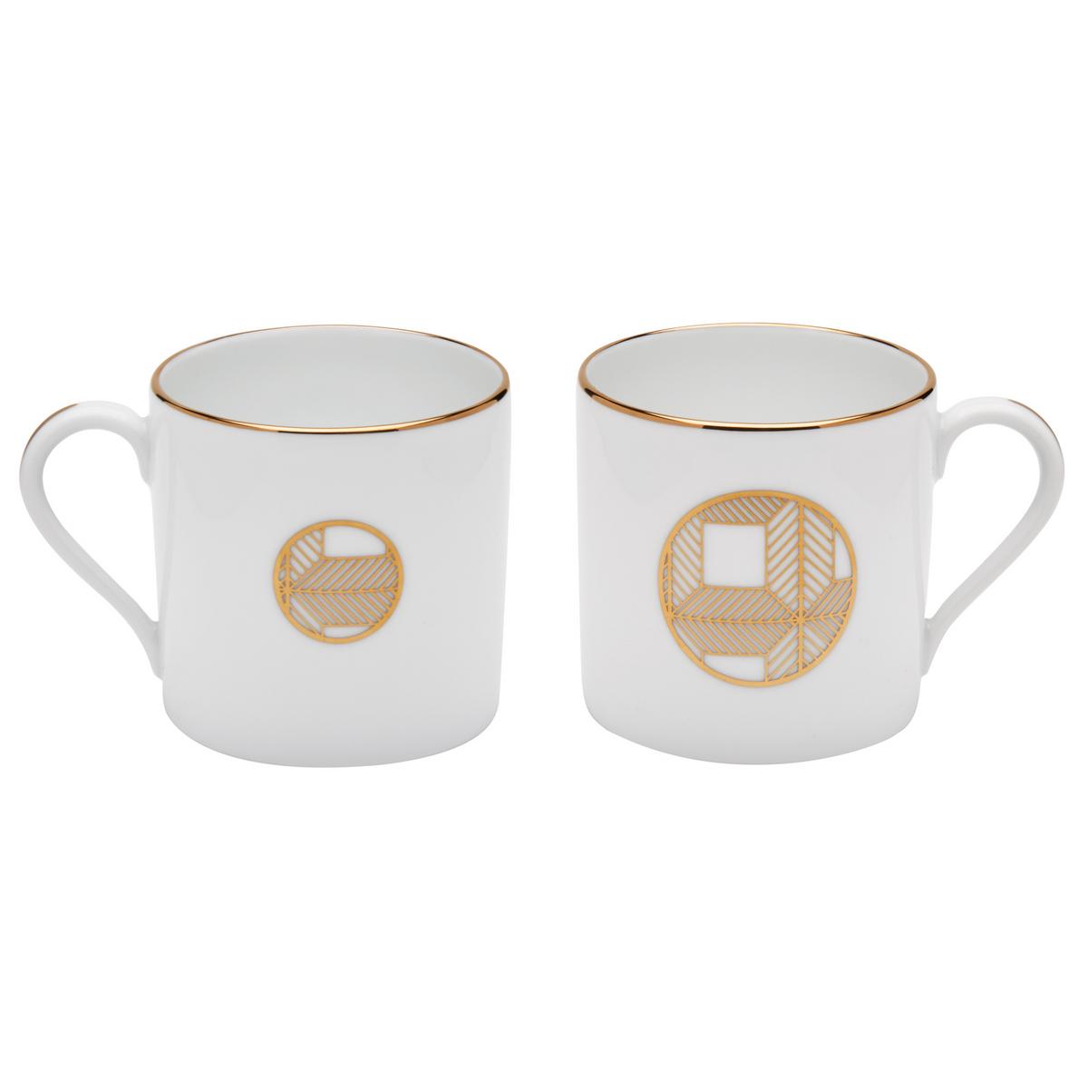 Mit den Mini-Henkelbechern aus Limoges-Porzellan schuf Haviland die perfekten Tassen, um ein köstliches Mahl mit einem Kaffee oder Espresso zu krönen. Jede Tasse ist an Vorder- und Rückseite mit zwei unterschiedlichen kreisförmigen Dekoren verziert. Diese Rosetten sind in Gold oder Platin eingerahmt und zeigen Vergrößerungen bekannter Designs der Porzellanmanufaktur Haviland.