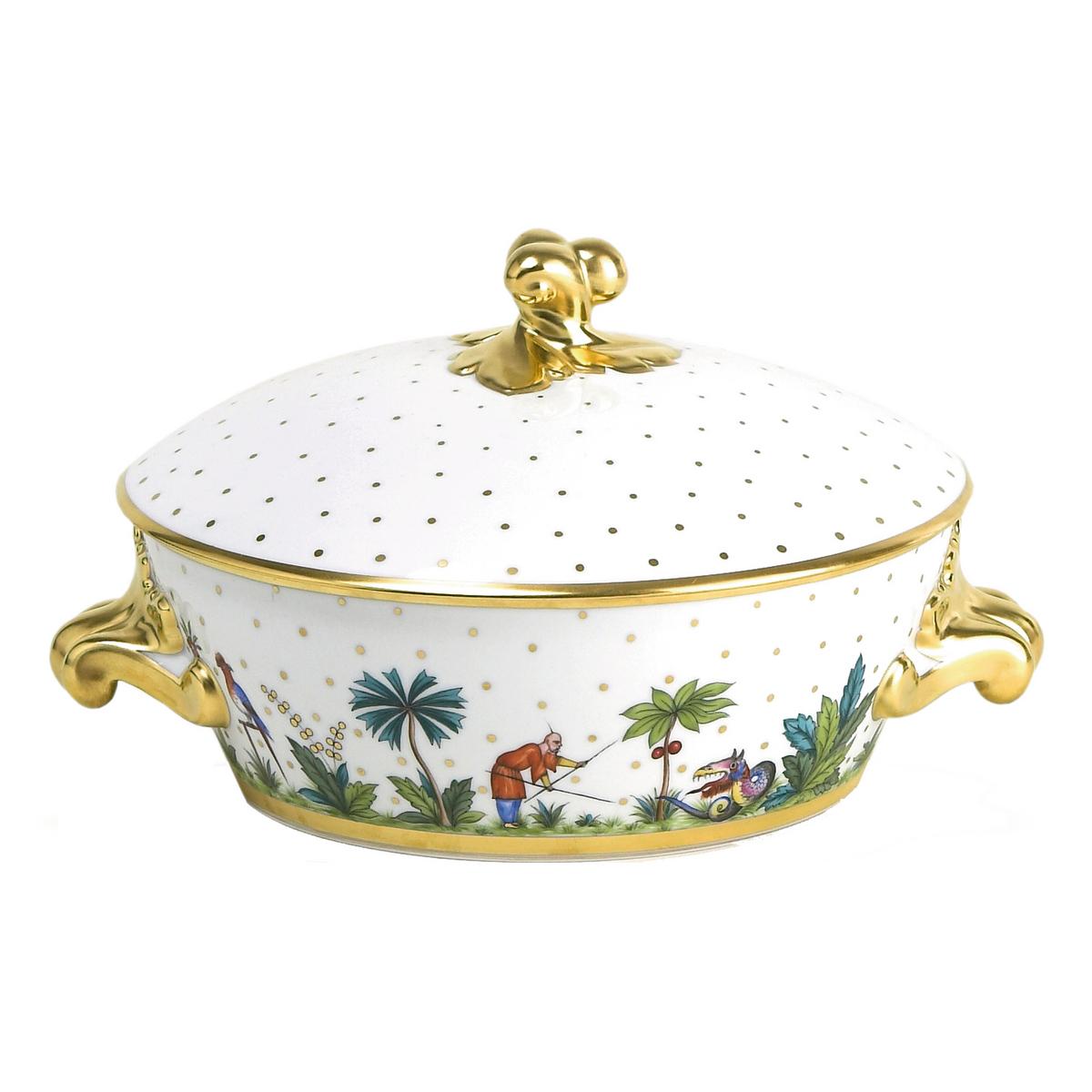 Ein fernöstlicher Traum in Porzellan und Gold. Das handbemalte Tafelservice "Forains d’Orient" der ungarischen Porzellanmanufaktur Herend kombiniert klassische asiatische Motive zu stimmungsvollen Arrangements. Herend präsentiert Menschen, Vögel, Drachen und reizvolle Pflanzen auf einem goldgesprenkelten Hintergrund. Prunkvoll umrahmt von opulenten Goldkanten und vergoldeten Henkeln. Auch die Ausgießer und Deckelknäufe der Kannen und Kännchen haben die Kunsthandwerker der ungarischen Porzellanlegende Herend aufwendig vergoldet.