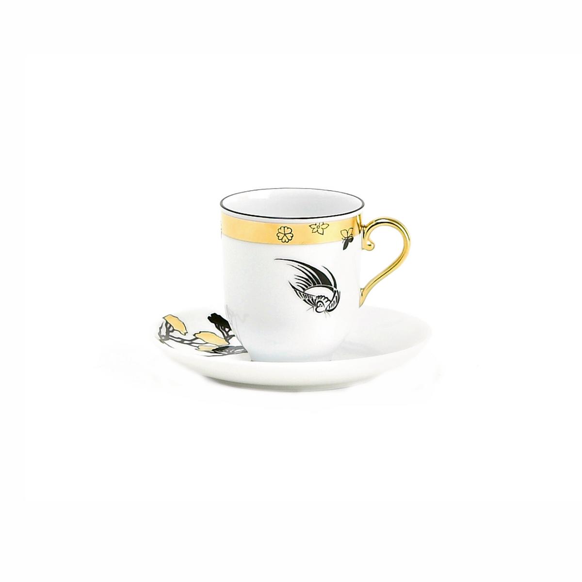 "Kimono" ist streng in den Farben Gold und Schwarz gehalten. Die Henkel der Tassen sind vergoldet und die Goldkanten von Tellern und Tassen verzieren schwarze Blätter, Blüten und Schmetterlinge. Das handbemalte Tafelservice "Kimono" fasziniert mit japanischem Minimalismus im teilvergoldeten Gewand des traditionsreichen ungarischen Porzellans von Herend.