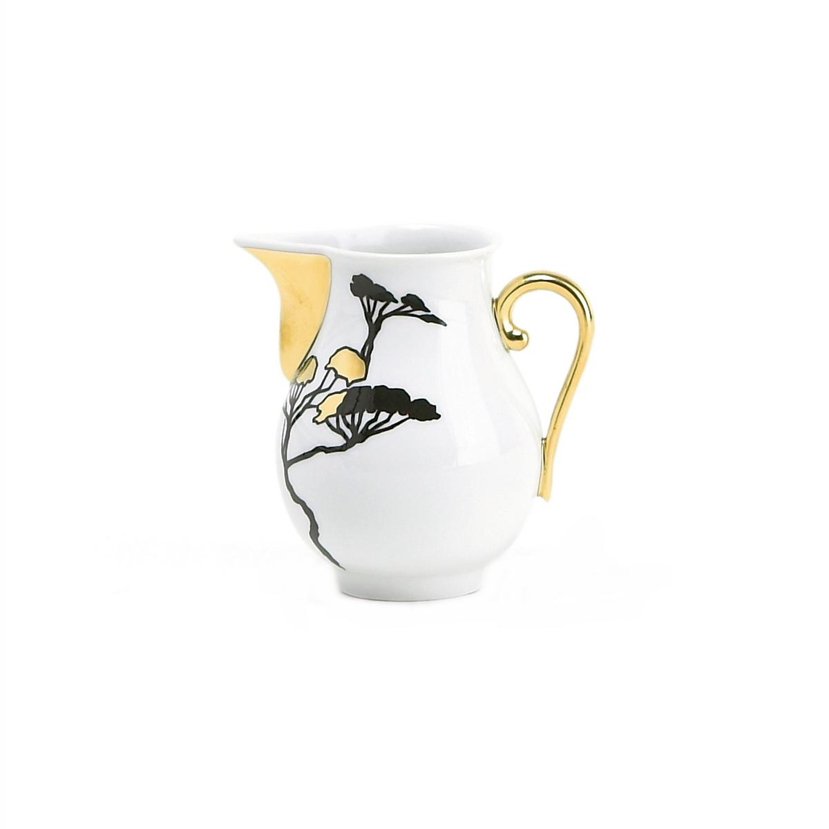 "Kimono" ist streng in den Farben Gold und Schwarz gehalten. Die Henkel der Tassen sind vergoldet und die Goldkanten von Tellern und Tassen verzieren schwarze Blätter, Blüten und Schmetterlinge. Das handbemalte Tafelservice "Kimono" fasziniert mit japanischem Minimalismus im teilvergoldeten Gewand des traditionsreichen ungarischen Porzellans von Herend.